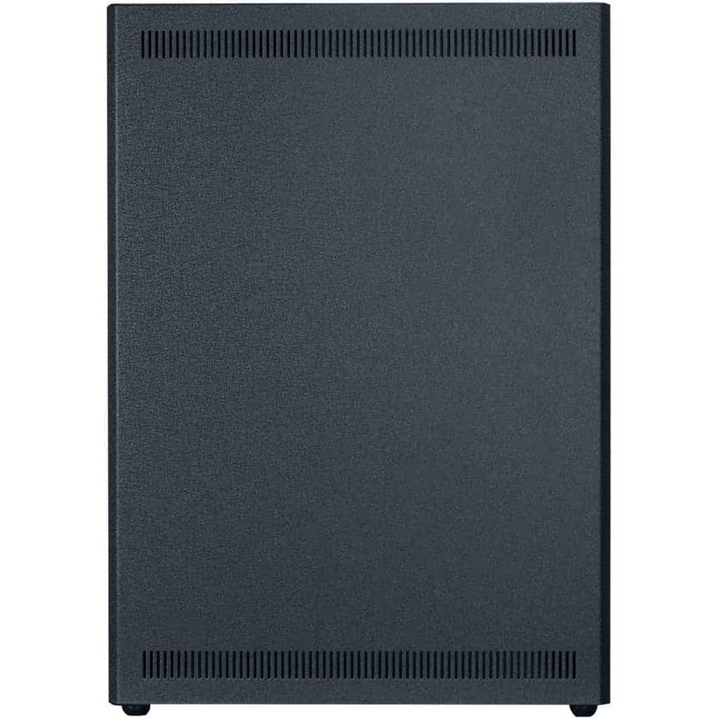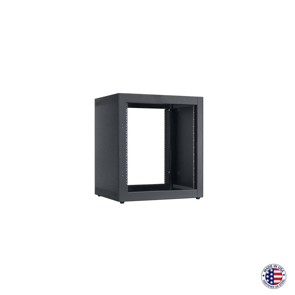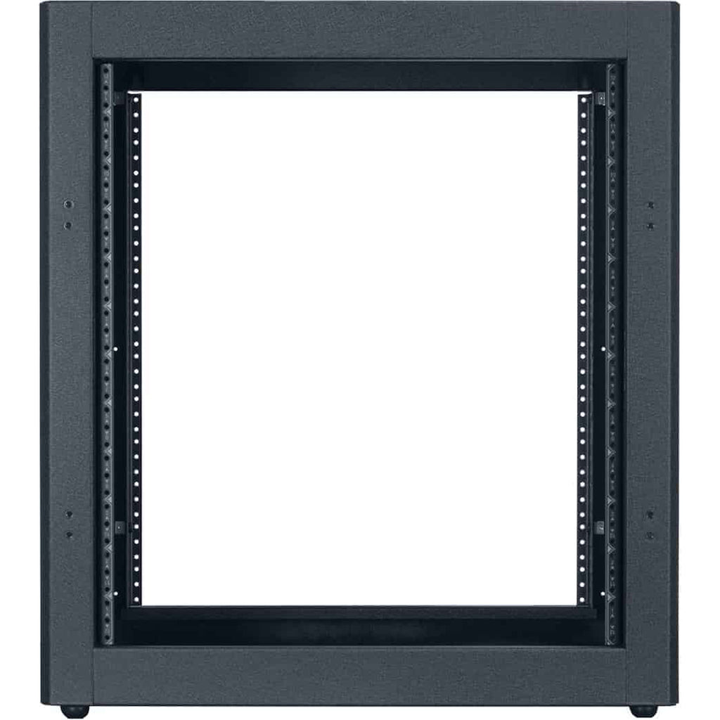 The LDTR-series provides easy access to A/V and control equipment in desk or credenza applications. Rack features welded 16-gauge steel on top, bottom and sides with fixed-position mounting rails in front and rear (all tapped 10-32). Front rails are recessed 0.83" from frame, providing 1.82" equipment clearance even when (optional) front door is added. Rack features knockouts on top and bottom, rubber feet to protect desktop, and side ventilation slots to allow passive heat dissipation. Black wrinkle powder epoxy finish.