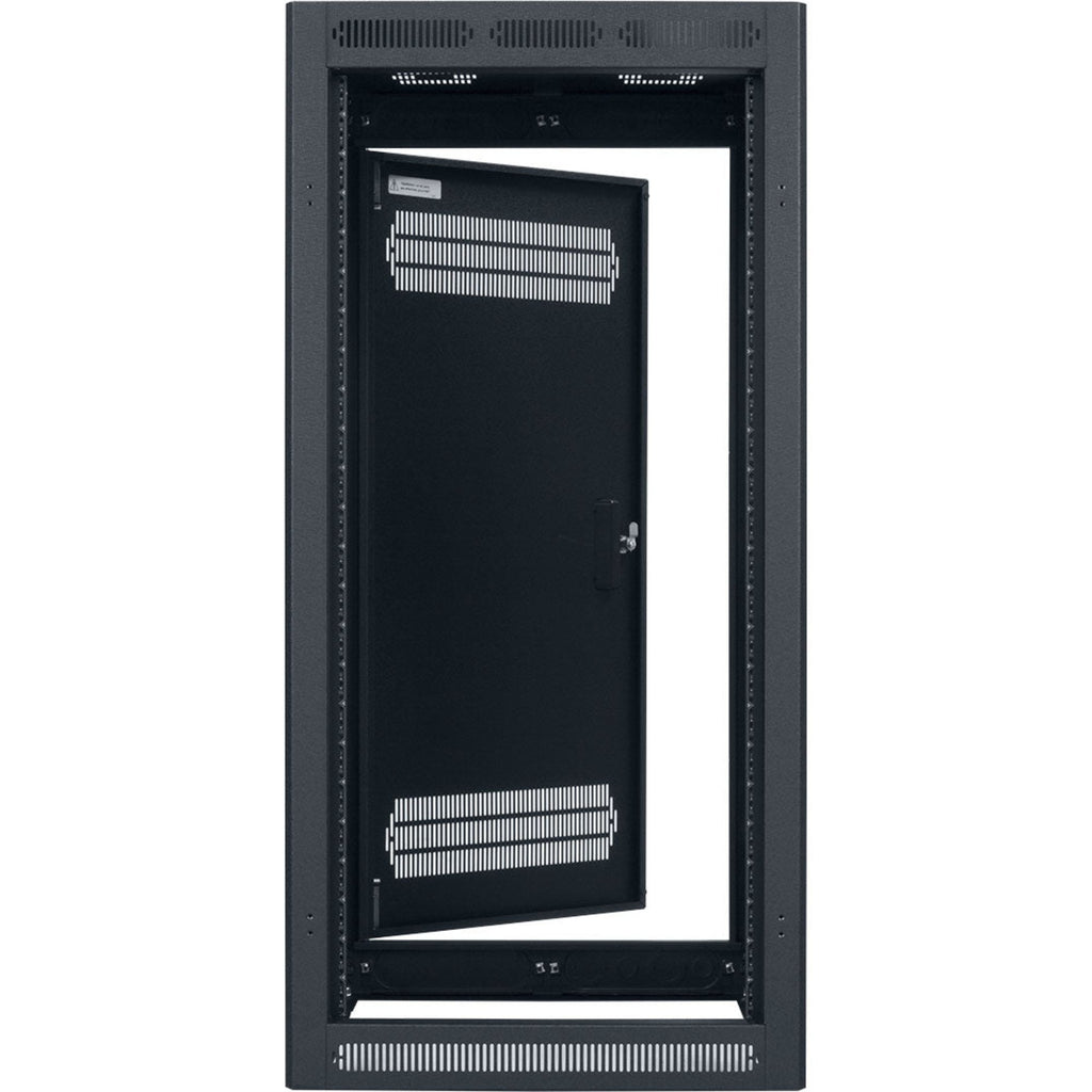 Enclosed Rack - adj. rails (LER-series): 19" EIA rack features adjustable mounting rails, fixed sides and rear door. Sides and door are vented top and bottom. Optional front door can be ordered separately. All-welded construction with 100% certified U.S. steel. UL Listed for loads up to 3150 lbs. (1429 kg). Beveled edges on four corners, black wrinkle powder epoxy finish.