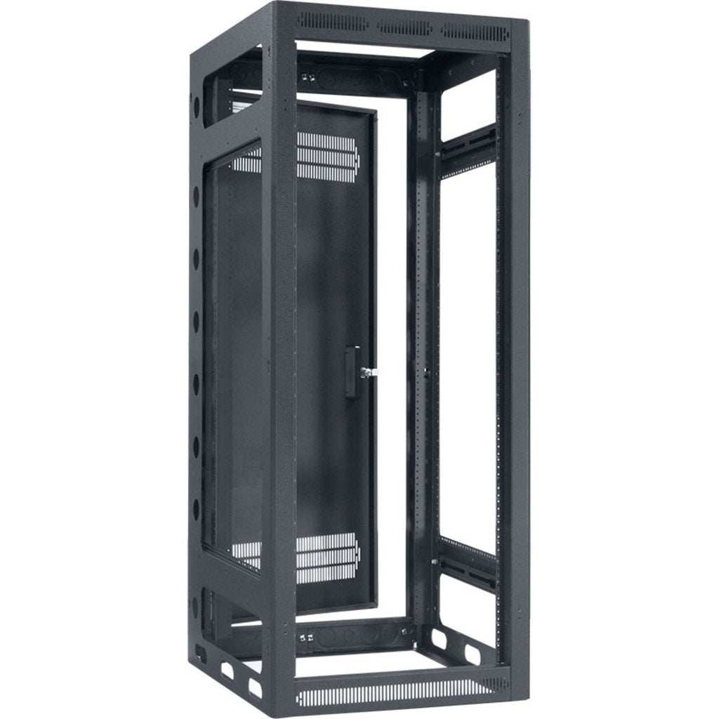 Ganging Rack (LGR-series): 19" EIA rack can be linked together, features open sides to facilitate access to wires and cable bundles. All-welded construction adds strength and durability. Load-tested to 3500 lbs. Plentiful, pre-drilled holes for wire looming, beveled edges on 4 corners, black wrinkle powder epoxy finish.