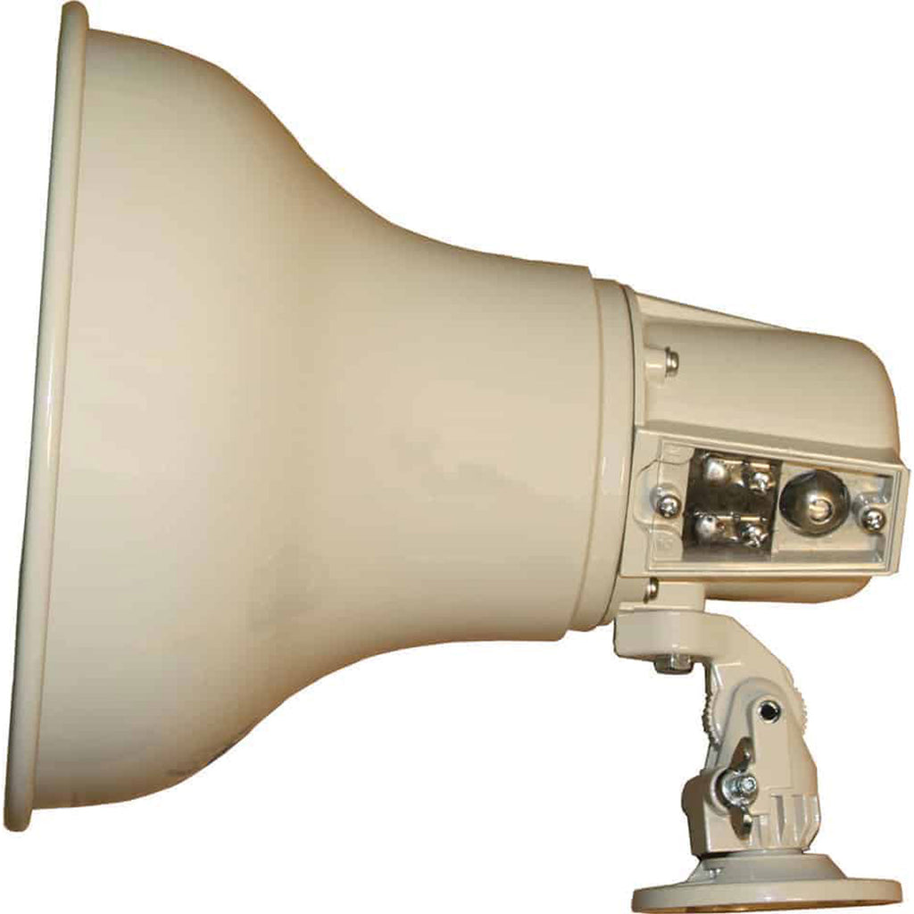 Horn includes a high quality transformer for use in 25V, 70V or 100V distributed applications (taps are selected with a screwdriver). Tap selector and screw terminal connections are located on rear, in recessed area with integral strain relief and protective plastic cover. Horn mounts using universal, swivel bracket for efficient installation and positioning. Mounting bracket base measures 2.875" dia. with three equally spaced holes (.28" dia.). Horn assembly measures 8.94" dia. x 9.38" deep and features all-metal construction with durable beige epoxy finish for long service life.