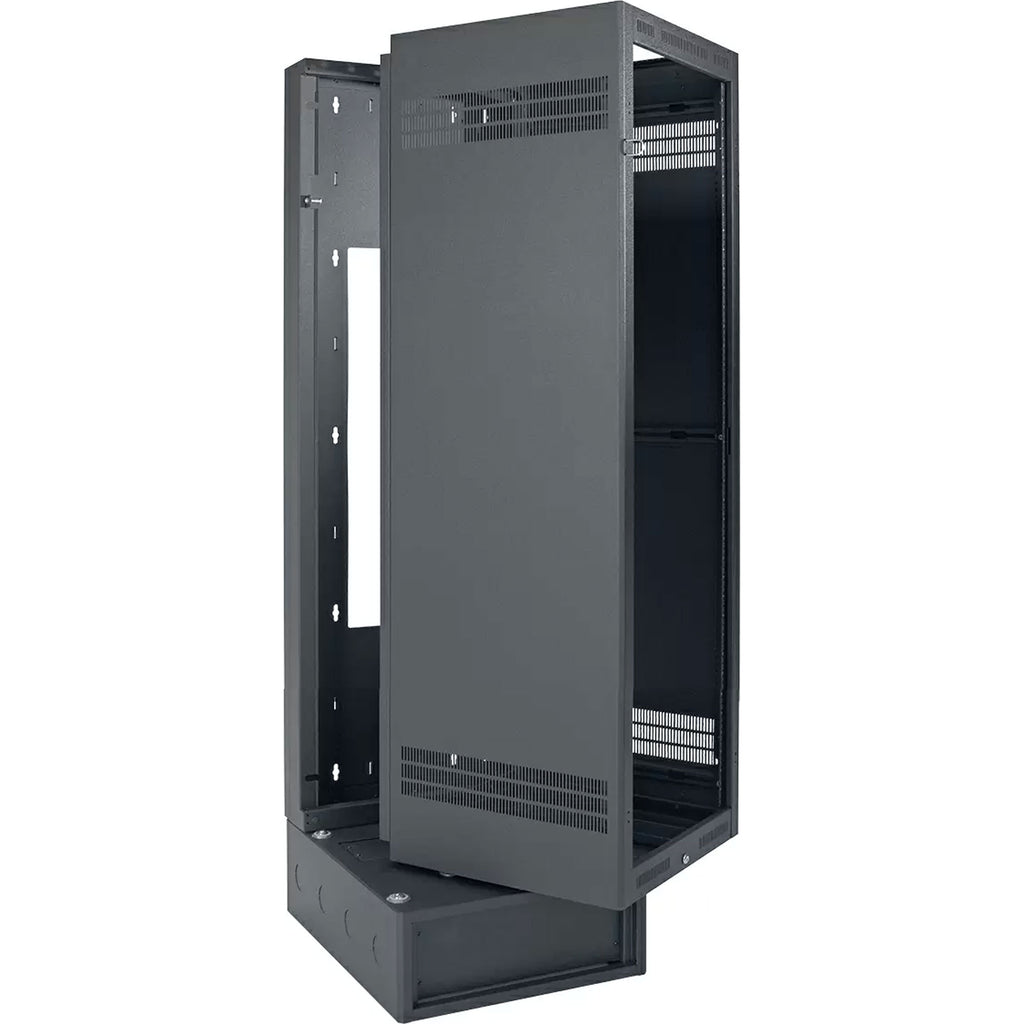 The E.I.A.-compliant LWBR is a pivoting cabinet that provides solid support and convenient access to equipment loaded in wallmount applications. The cabinet swings open easily using a single-release loop-style grasp with slam-latch closure. It pivots smoothly on stainless steel ball transfers set into the base. The base provides additional 4 rack units for electronic equipment or optional utility drawer. Open top features integral rack rail with E.I.A. spacing to support optional 19" E.I.A. fan panels. Key-lock on front secures cabinet to backbox while allowing side-by-side installations. Welded 16-gauge steel construction is finished with beveled corners and a durable black wrinkle powder epoxy paint. Front doors for cabinet and base are optional.