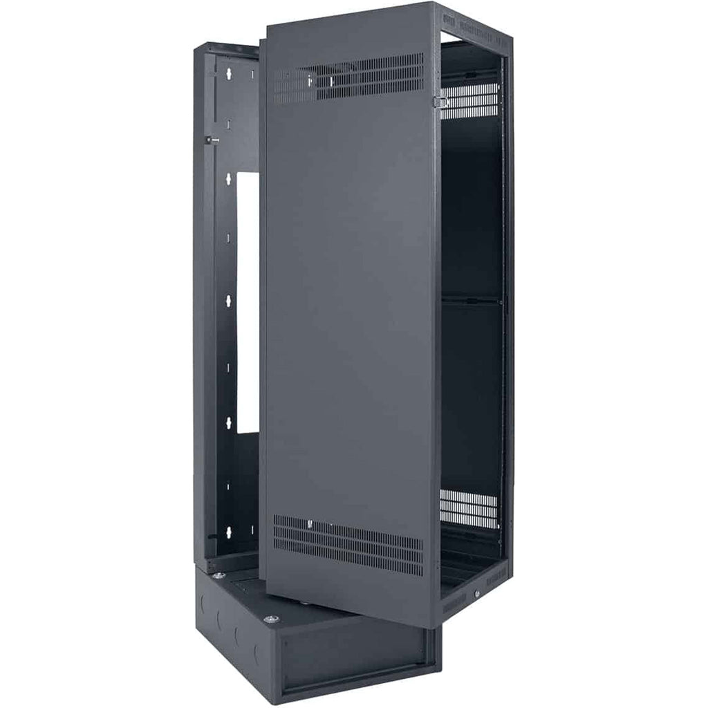 The E.I.A.-compliant LWBR is a pivoting cabinet that provides solid support and convenient access to equipment loaded in wallmount applications. The cabinet swings open easily using a single-release loop-style grasp with slam-latch closure. It pivots smoothly on stainless steel ball transfers set into the base. The base provides additional 4 rack units for electronic equipment or optional utility drawer. Open top features integral rack rail with E.I.A. spacing to support optional 19" E.I.A. fan panels. Key-lock on front secures cabinet to backbox while allowing side-by-side installations. Welded 16-gauge steel construction is finished with beveled corners and a durable black wrinkle powder epoxy paint. Front doors for cabinet and base are optional.