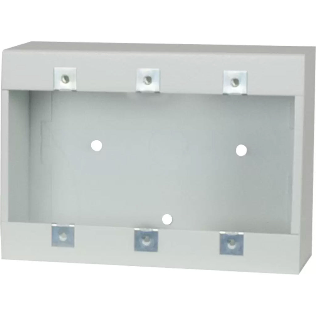 Surface-mount boxes for intercoms, wall plates or devices have front flanged holes that conform to standard wall plate centers. Box measures 2.5 in. deep and features half-inch conduit knockouts and mounting holes in rear. One, two, or three-gang.