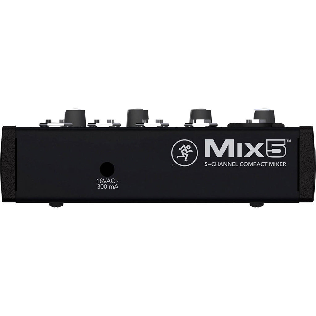 The Mackie Mix5 is a 5-channel compact mixer that features high quality components, a rugged metal chassis, and is designed for a variety of sound reinforcement applications. The mixer features one mic/line input, two stereo 1/4" line inputs, and is capable of accommodating dynamic microphones, keyboards, DJ setups, portable music players, and more.