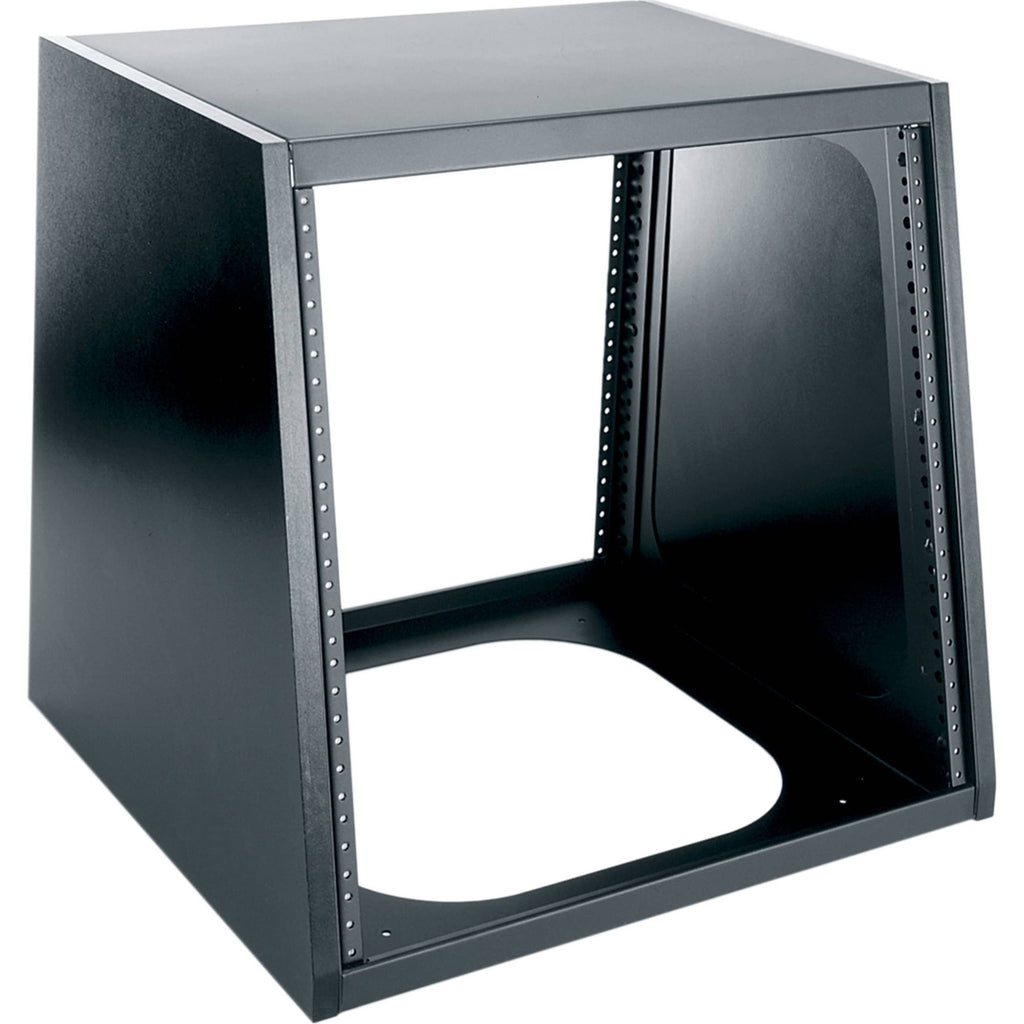 The 2-10 rack ships fully assembled and incorporates a sturdy black steel open frame and removable black laminate side panels. Featuring a sloping rack face for easy equipment viewing, this frame can be easily joined, with the open sides and bottom allowing for quick wire passage. Front and rear heavy-gauge, 10-32 threaded rackrail is standard.