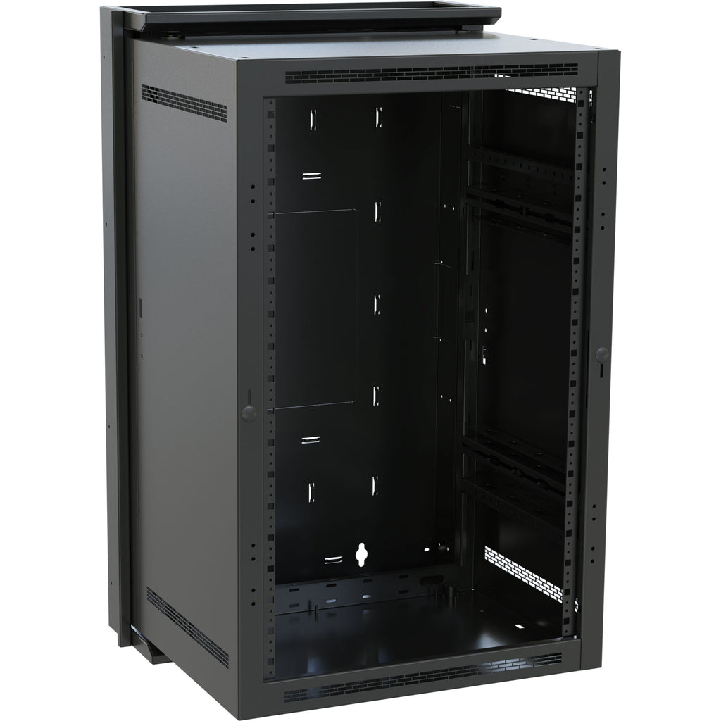 This rack offers unsurpassed cable management features. Abundant, built-in cable lacing points and touch-fastener tie points allow you to organize any quantity of cables. And numerous knockouts on the top, bottom, and back offer numerous pass through points for cabling. The top and bottom of the rack includes 1/2", 3/4", 1", 1-1/2", 2" and 3" electrical knockouts and a 5/8" knockout for UHF/VHF antenna. The backpan features a 12-1/2" x 12-1/2" laser knockout opening for an electrical pull-box. And the side offers 2" and 4" knockouts for Wiremold 4000 Series raceways and UCP series universal connector panels. Laser knockouts in the center section, top, and bottom accommodate up to four (4) 4-1/2" fans.