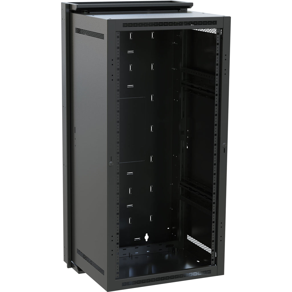 This rack offers unsurpassed cable management features. Abundant, built-in cable lacing points and touch-fastener tie points allow you to organize any quantity of cables. And numerous knockouts on the top, bottom, and back offer numerous pass through points for cabling. The top and bottom of the rack includes 1/2", 3/4", 1", 1-1/2", 2" and 3" electrical knockouts and a 5/8" knockout for UHF/VHF antenna. The backpan features a 12-1/2" x 12-1/2" laser knockout opening for an electrical pull-box. And the side offers 2" and 4" knockouts for Wiremold 4000 Series raceways and UCP series universal connector panels. Laser knockouts in the center section, top, and bottom accommodate up to four (4) 4-1/2" fans.