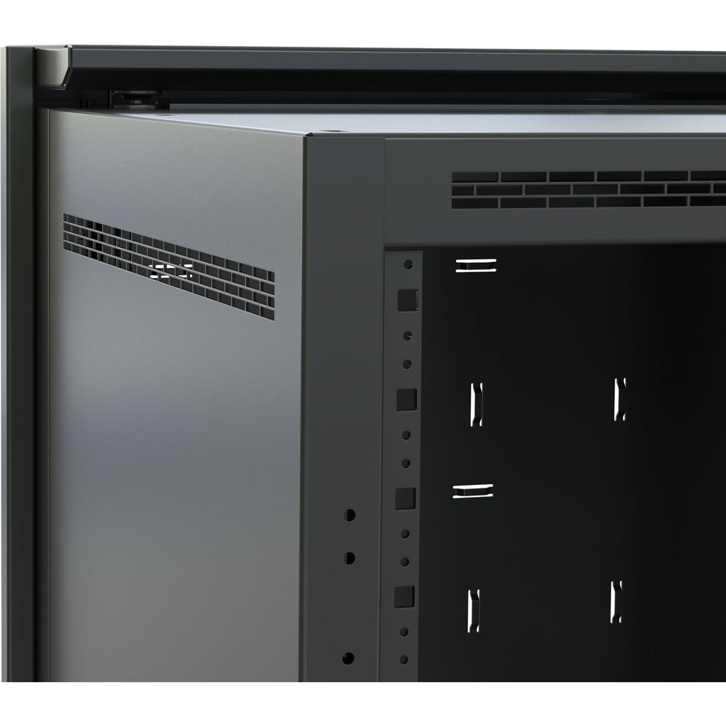 This rack offers unsurpassed cable management features. Abundant, built-in cable lacing points and touch-fastener tie points allow you to organize any quantity of cables. And numerous knockouts on the top, bottom, and back offer numerous pass through points for cabling. The top and bottom of the rack includes 1/2", 3/4", 1", 1-1/2", 2" and 3" electrical knockouts and a 5/8" knockout for UHF/VHF antenna. The backpan features a 12-1/2" x 12-1/2" laser knockout opening for an electrical pull-box. And the side offers 2" and 4" knockouts for Wiremold 4000 Series raceways and UCP series universal connector panels. Laser knockouts in the center section, top, and bottom accommodate up to four (4) 4-1/2" fans.