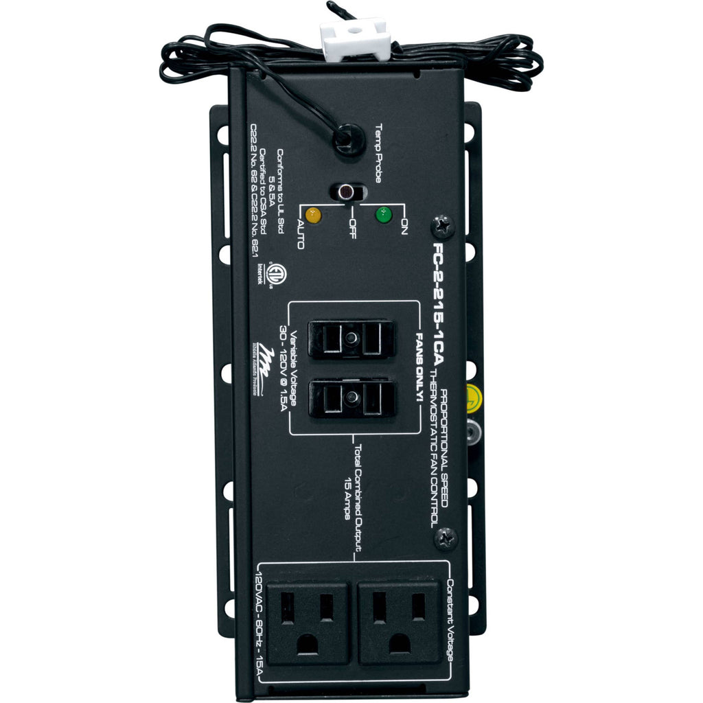 The Middle Atlantic Products FC-2-215-1CA Thermostatic Fan Control extends the equipment and fan life, and reduces service calls by varying the fan speed up to 2 fans, based on the temperature within the enclosure. Featuring 3 temperature ranges, the fan control can be set to activate proportional to the enclosure temperature, or to come on at full power whenever the temperature threshold is reached.