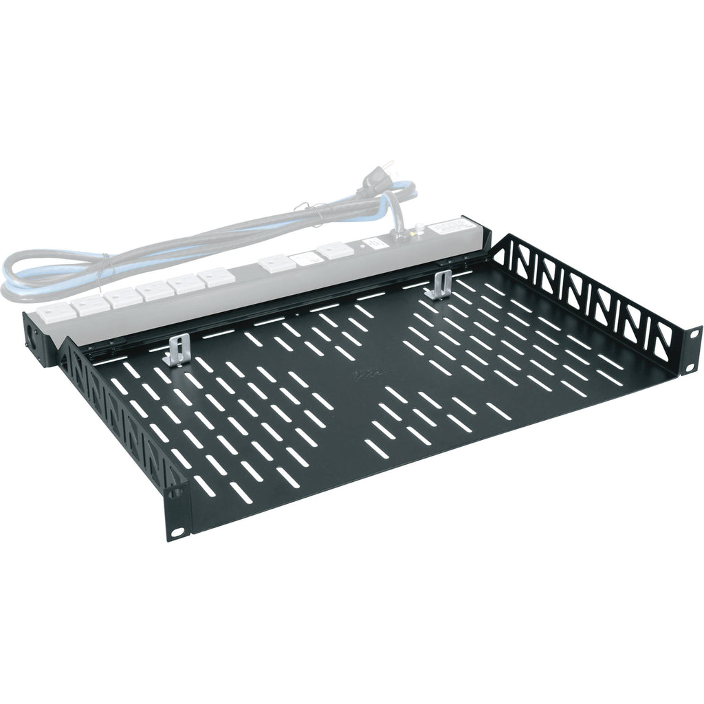 Featuring fully ventilated bottom and sides for heat dissipation, these fully welded, easy-to-install shelves fit all components up to 17 3/8" wide to quickly meet all of your rackmounting needs. Made from 16-gauge steel, each unit is individually boxed. Includes 3 rear brackets to prevent components from sliding backwards. This shelf helps to save valuable space by accepting the mounting of the PD-815SC-PBSH 8 outlet, 15 amp power strip on the rear of shelf (Requires 2 1/4" deep by 18 3/4" wide open space behind the shelf). Also allows the attachment of optional clamping bars to secure components.