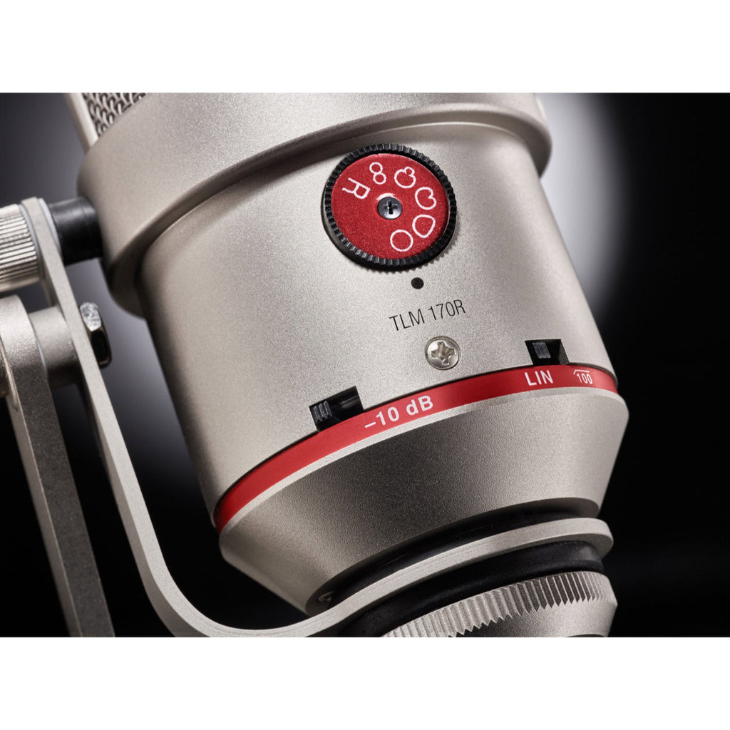The TLM 170 R condenser microphone is a large diaphragm microphone with multiple polar patterns. Its sound has a very transparent characteristic, in contrast to some of our other microphones that have a distinct personality.