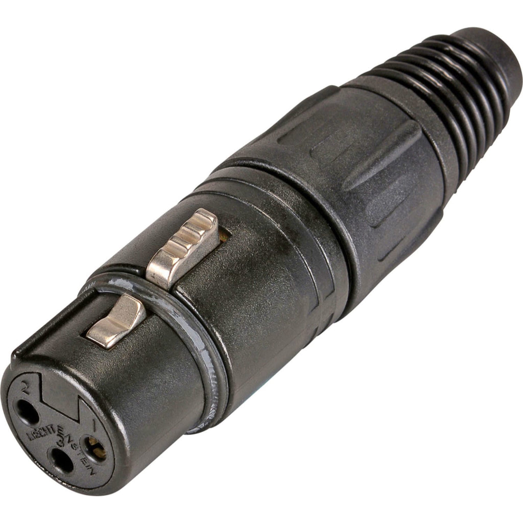 The "industry standard" XLR cable connector, easy to assemble with only 4 parts and no screws. Compact design with sturdy diecast shell, fibreglass reinforced hard plastic insert and chuck type strain relief for secure clamping of all cables.