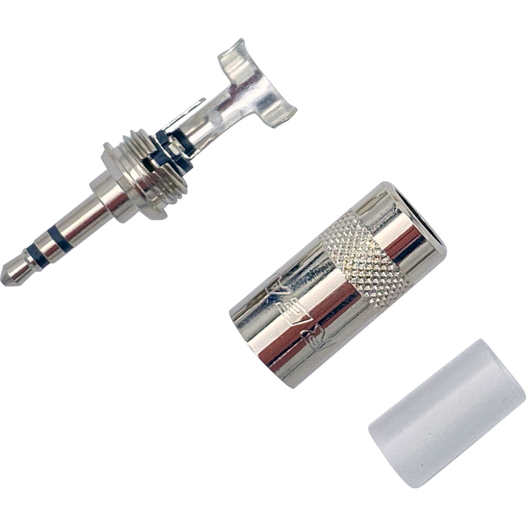 Neutrik REAN NYS231 3.5mm 3-pole TRS stereo male plug audio connector features a diecast metal shell and heavy-duty crimp strain relief. This connector features a nickel finished metal housing, and nickel-plated machined brass contacts. Easy to assemble with oversized solder contacts. This connector will accept up to 8 mm OD cable.