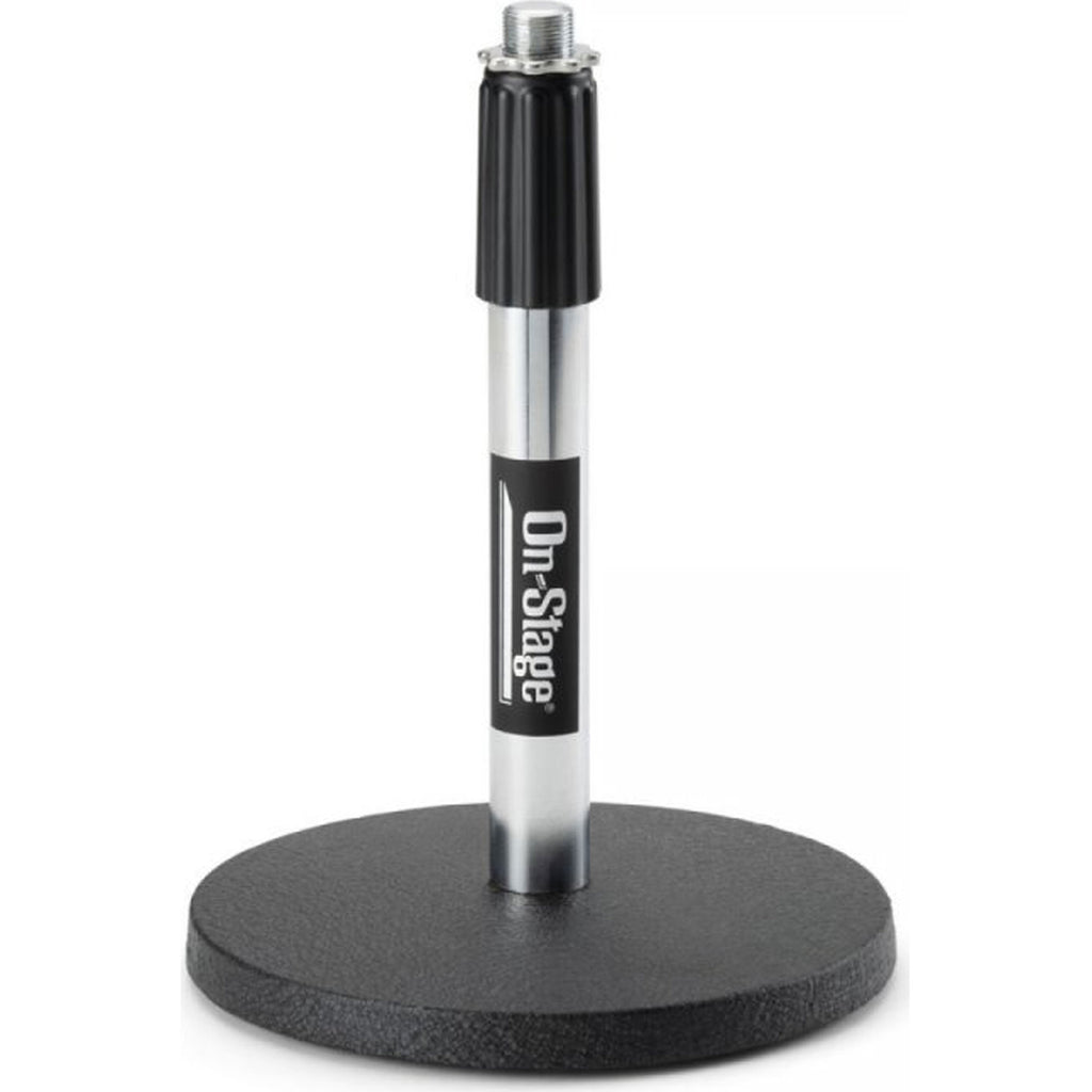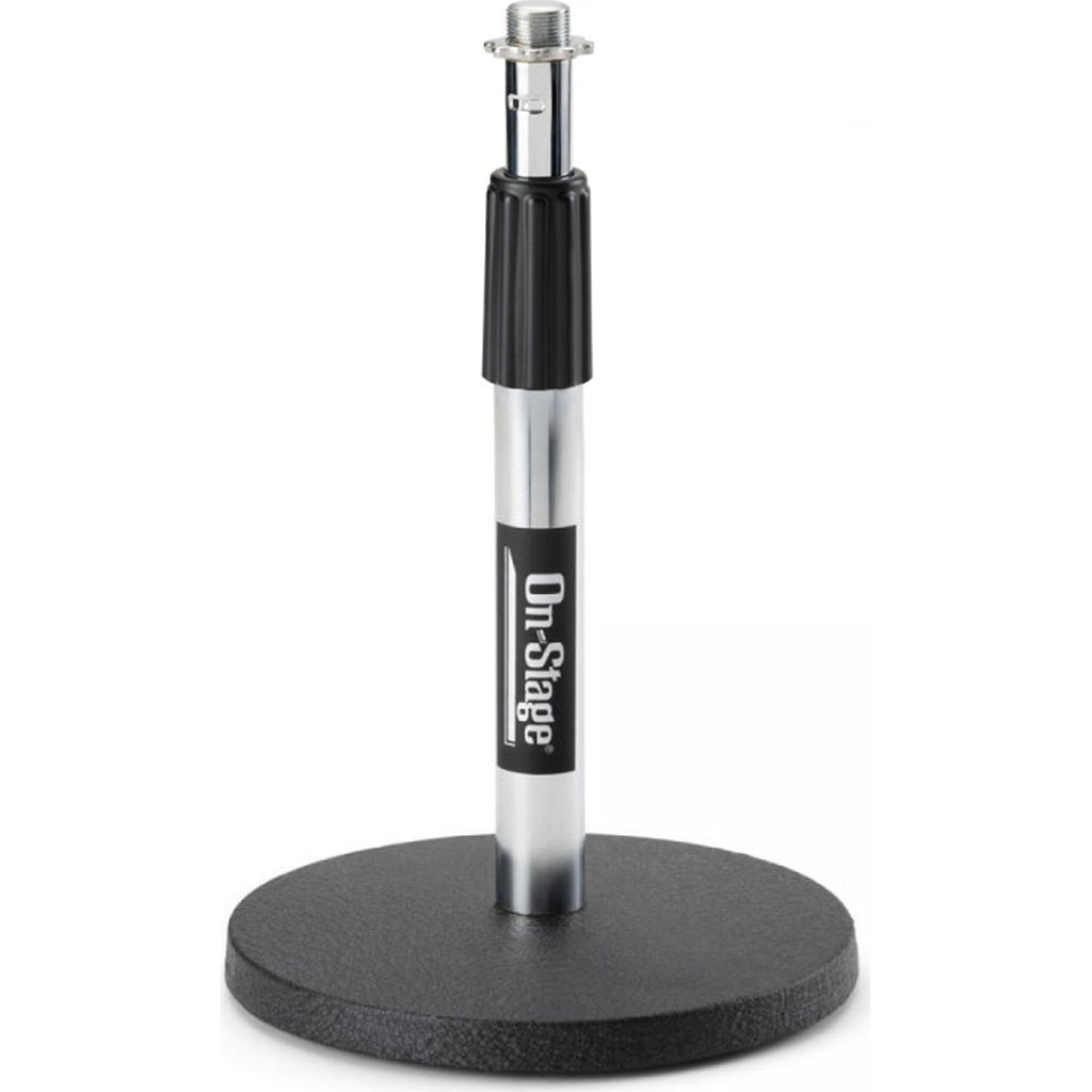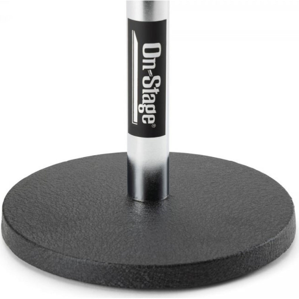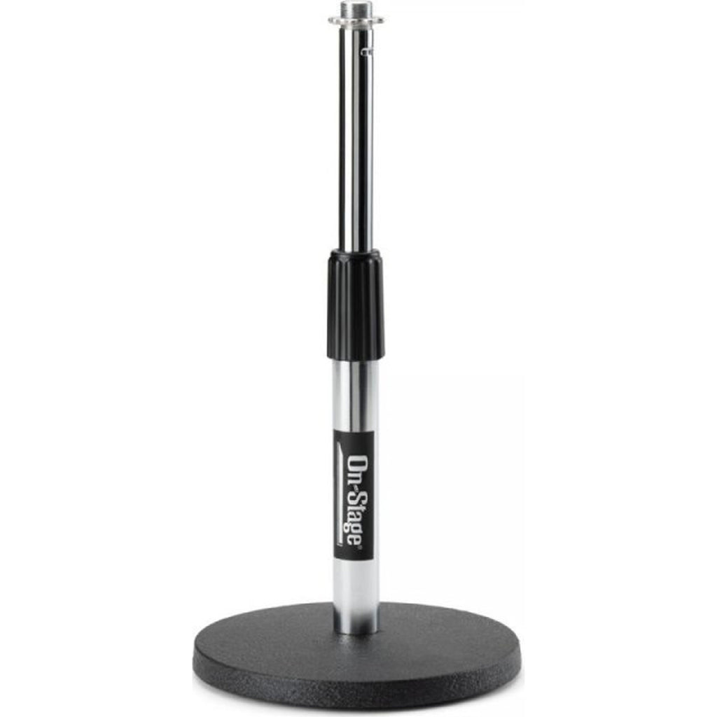 Our DS7200C Adjustable Desktop Mic Stand excels at short-height miking applications. The removable straight shaft adjusts in height from 9" to 13" and mounts standard mic clips and accessories. A heavy base provides stability and balance for reliable mic support. Nonslip rubber feet reduce vibrations to prevent mic rumble. A model of functional simplicity, this stand makes quick work of setting up a mic on a desk or podium.