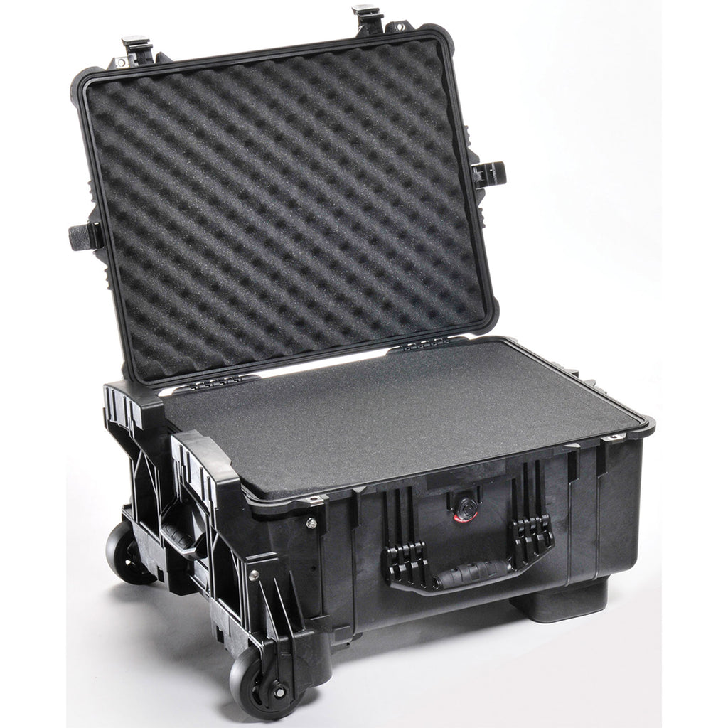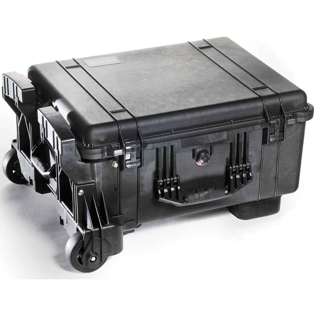 The 1610M Case from Pelican is an airtight, crushproof, dust and water resistant hard case for use in rugged terrain. It includes a mobility kit which adds a retractable extension handle and a built-in dolly system with 4" polyurethane wheels and stainless steel ball bearings. You can travel knowing that your gear inside this case is protected thanks to its solid polypropylene walls and watertight polymer o-ring seal. An automatic purge valve allows you to open the case after changes in atmospheric pressure at any altitude, making it suitable for air travel. The double-throw latches on the side of the case can withstand almost 440 lb of pressure, yet allow you to open and close the case with a light push or pull. The Pick N Pluck foam inside the case allows you to custom fit your gear into the large compartment of the case. Stainless steel hardware and padlock protectors prevent corrosion while providing extra strength against theft.