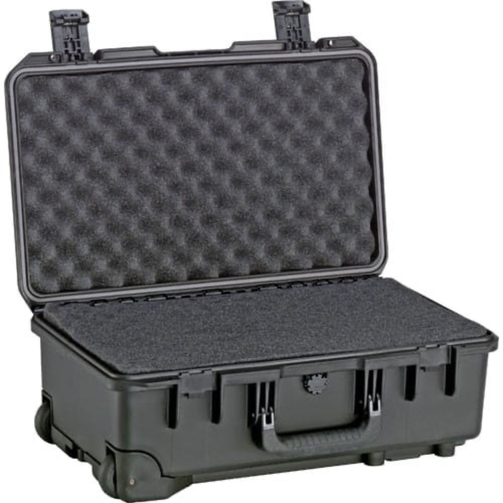 The Pelican iM2500 Storm Trak Case with Foam is an injection-molded case made of HPX high performance resin, that is virtually unbreakable, dent-resistant and shatter-resistant. It is tough, rugged, lightweight, airtight and watertight. There is a permanently attached Vortex valve that automatically adjusts air pressure without letting in water, and won't unscrew from the case. Press & Pull latches open with the push of a button, yet stay closed securely under impact or stress. The case has unbreakable molded-in hasps that allow the addition of standard size padlocks. It has hinges with integrated feet that hold fast under impact, and create a flat surface for upright stability. It is carried by a double-layered, soft-grip, solid-core handle, lightweight retractable, telescoping handle and rugged in-line wheels.