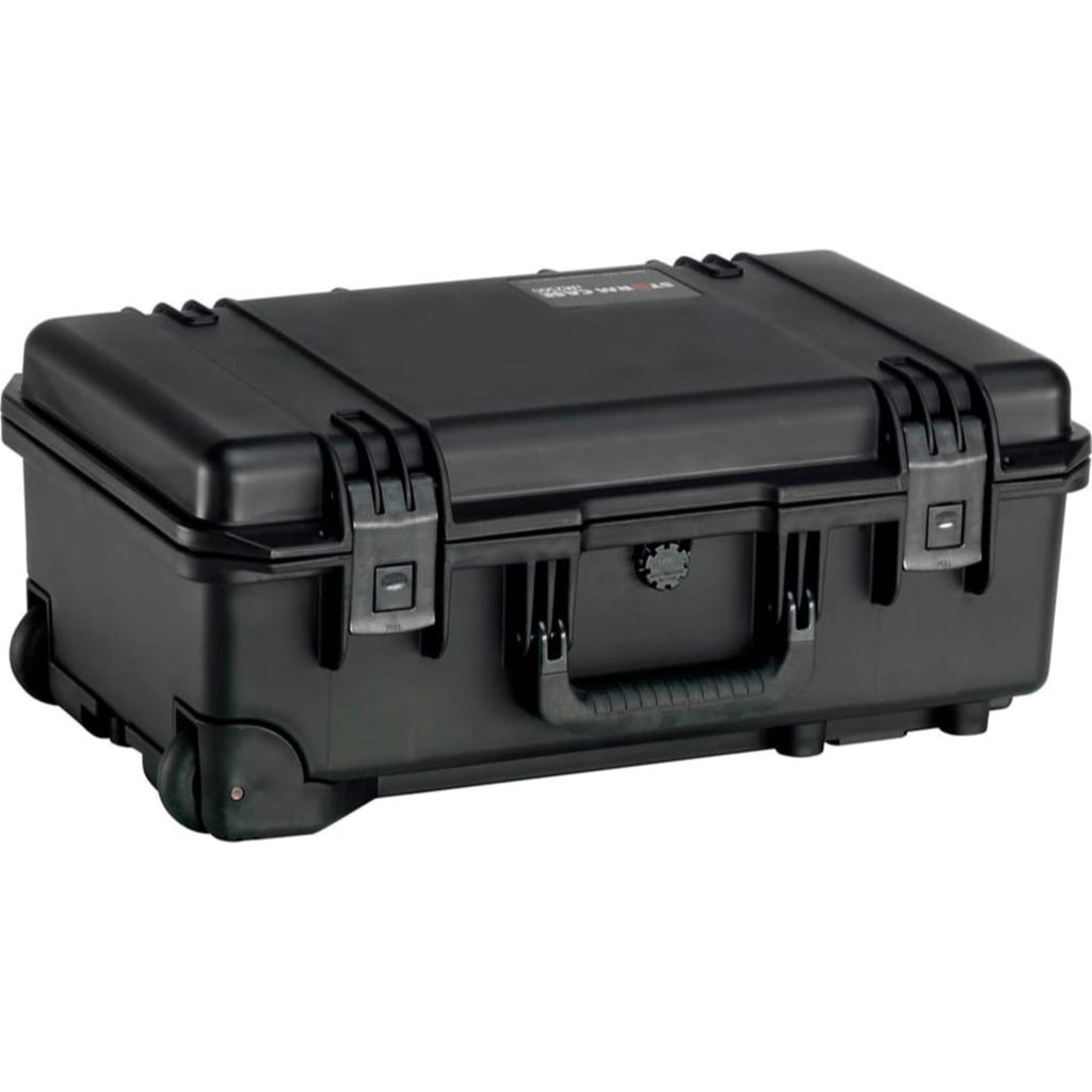 The Pelican iM2500 Storm Trak Case without Foam is an injection-molded case made of HPX high performance resin, that is virtually unbreakable, dent-resistant and shatter-resistant. It is tough, rugged, lightweight, airtight and watertight. There is a permanently attached Vortex valve that automatically adjusts air pressure without letting in water, and won't unscrew from the case. Press & Pull latches open with the push of a button, yet stay closed securely under impact or stress. The case has unbreakable molded-in hasps that allow the addition of standard size padlocks. It has hinges with integrated feet that hold fast under impact, and create a flat surface for upright stability. It is carried by a double-layered, soft-grip, solid-core handle, lightweight retractable, telescoping handle and rugged in-line wheels.