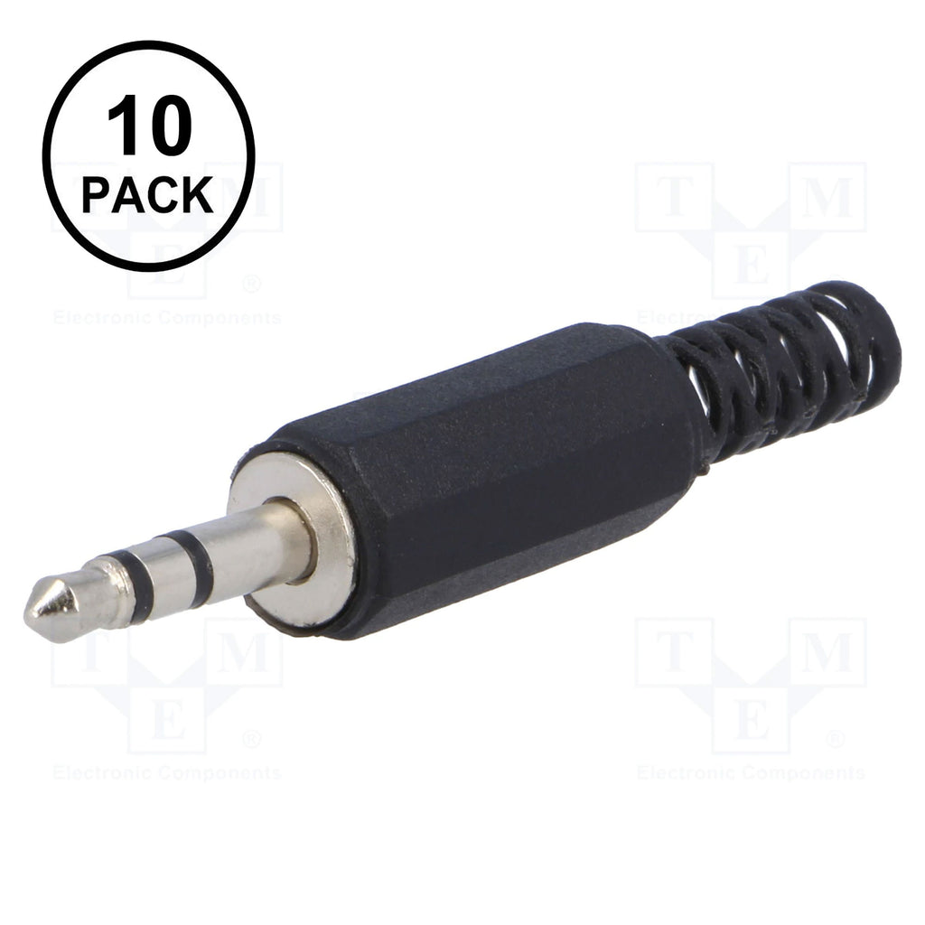 3.5mm (1/8") TRS Stereo In-Line Male Jack Solder Connector with Strain Relief - Black Plastic - Package of 10 Connectors