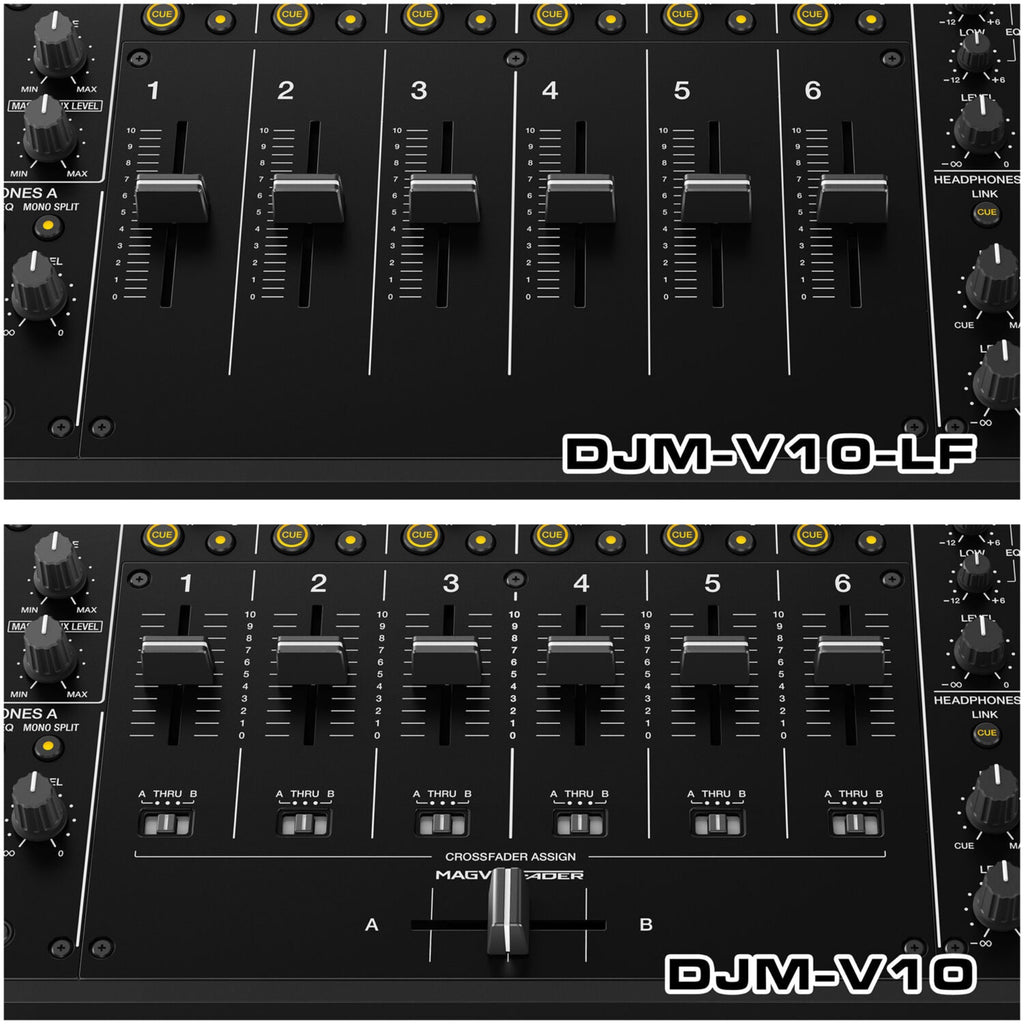 Building upon the success of the DJM-V10, the black Pioneer DJM-V10-LF removes the crossfader and extends the channel faders for more volume precision. Some DJs prefer to use the channel faders over the crossfader, as they offer more control to perform smooth blends with tiny adjustments to the volume of each track, or quickly drop sounds into the mix as if playing a musical instrument.