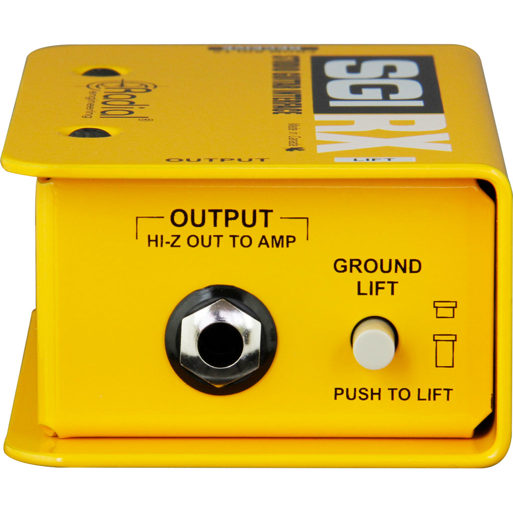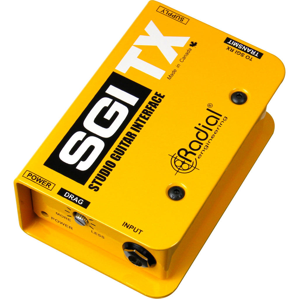 The Radial SGI studio guitar interface allows a guitar signal to travel 100 meters (328 feet) over a standard balanced XLR mic cable. This enables the guitarist to play through a distant amplifier while listening to the performance in the control room. On large stages, the SGI allows a guitar signal to travel from the wireless system to a pedal board and amplifier. The SGI employs a proprietary drive and balancing circuit that is made up of two modules: the SGI-TX transmit module and SGI-RX receive module. The SGI-TX is active with 100% discreet class-A circuitry and Drag control load correction to ensure the most natural sound. The SGI-RX is completely passive. To eliminate hum and buzz caused by ground loops, each module is equipped with isolation transformers that are wired in opposing directions to counteract any artifact. Best of all, the SGI is plug & play easy to use and comes equipped with power supply.