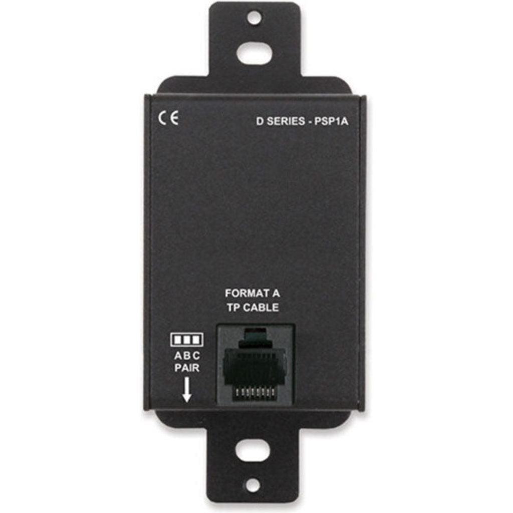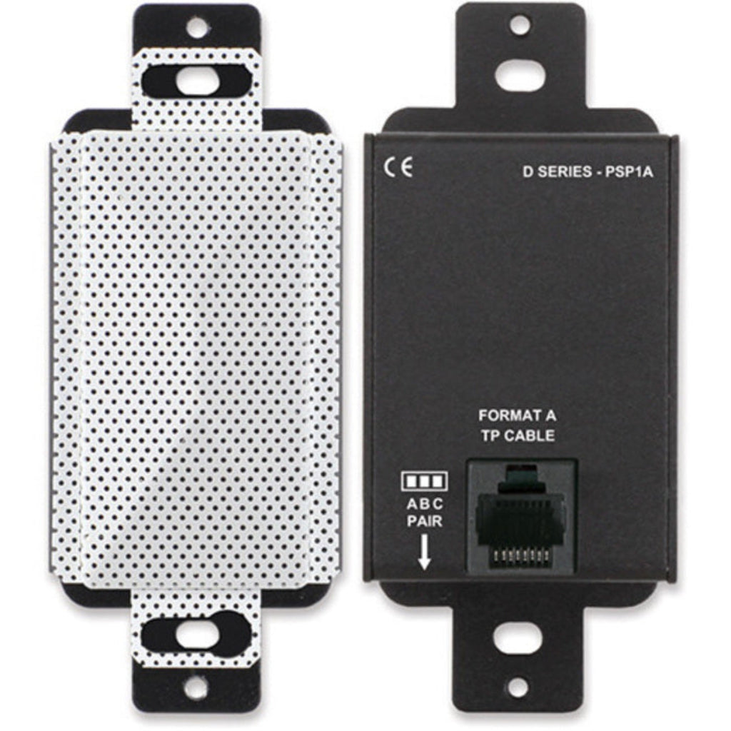 The D SERIES-PSP1AF is a compact active loudspeaker that delivers rich, detailed sound in Decora-compatible wall or chassis mounts. It is a single-pair audio amplifier module compatible with RDL Format A twisted pair products. The PSP1AF receives audio and 24 Vdc power through a rear-panel RJ45 jack. A rear-panel switch set during installation determines which of the three FORMAT-A pairs is amplified. Amplification is provided by a high-efficiency Class D power stage with audio filtering tailored for crisp, pleasant audio clarity. The high-efficiency Class D output stage produces negligible heat for all levels of expected voice or music modulation. The amplified output level is set by the installer using a volume control located behind the speaker grill. The PSP1AF includes an analog compressor/limiter that makes higher average sound output levels possible without clipping.