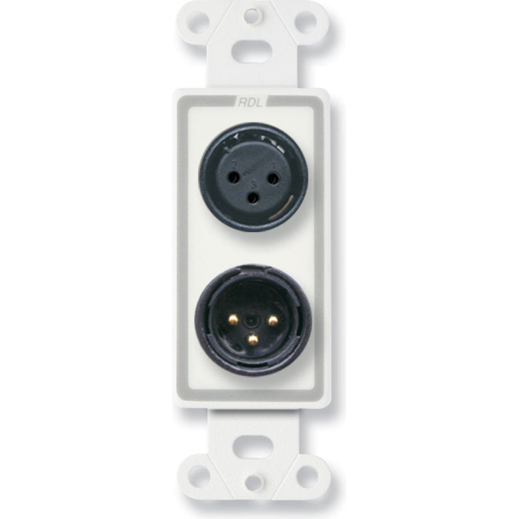 The white D-XLR2 Decora Wall Plate from RDL features a XLR 3-pin female and a XLR 3-pin male connector with rear panel connections on terminal block. This unit can be mounted in WB-1U and WB-2U Universal Wall Boxes (not included).