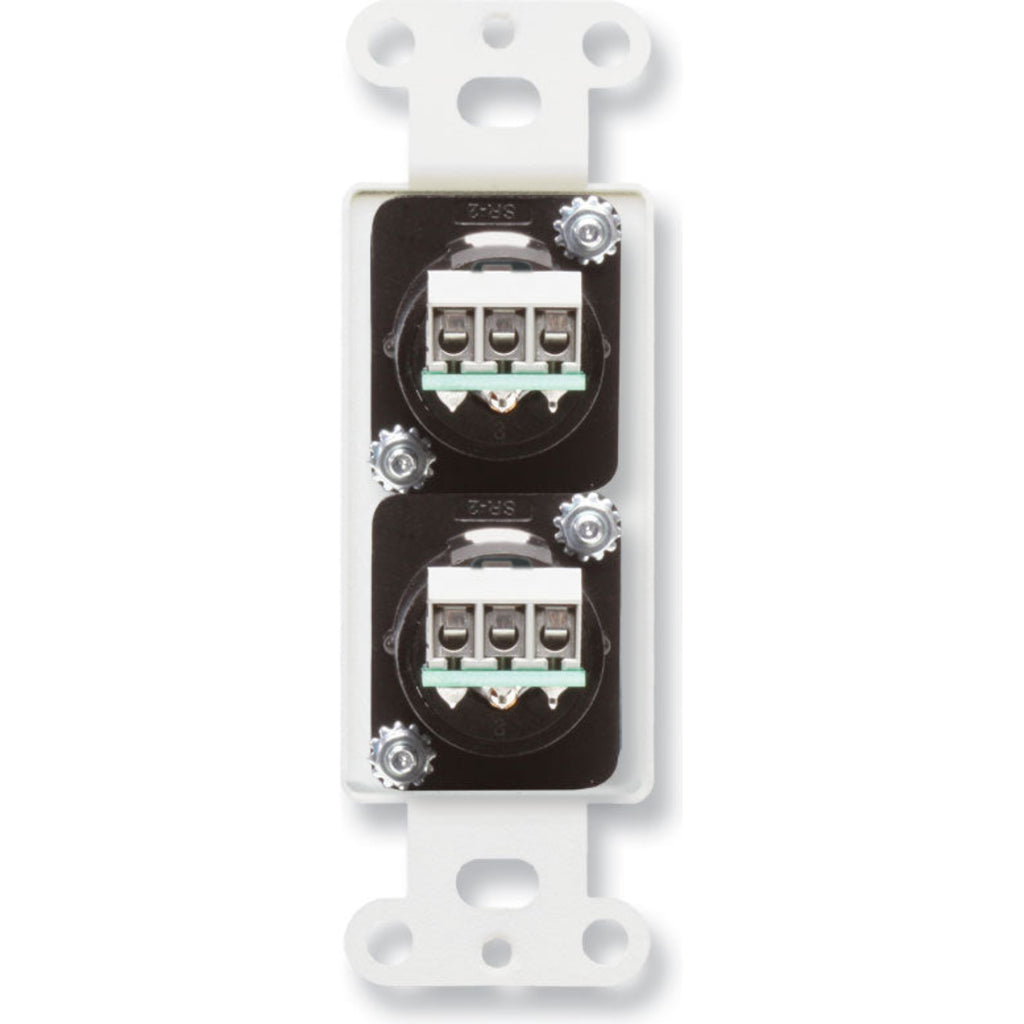 The white D-XLR2F Decora Wall Plate from RDL features two XLR 3-pin female connectors with rear panel connections on terminal block. This unit can be mounted in WB-1U and WB-2U Universal Wall Boxes (not included).