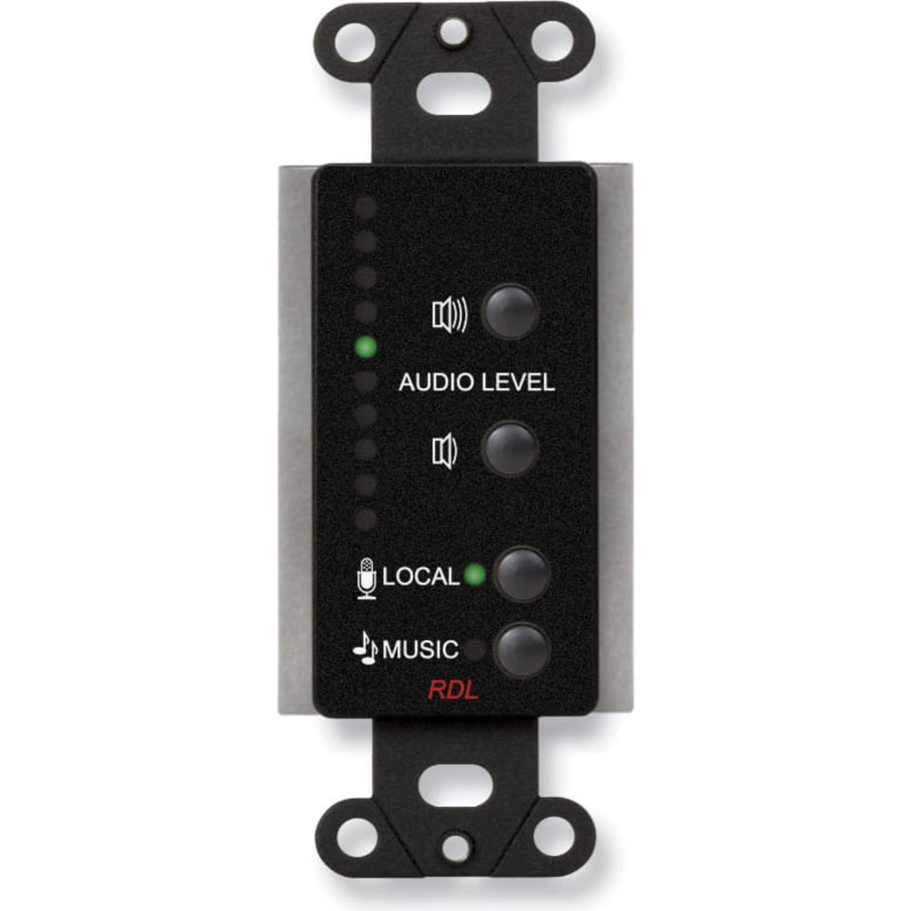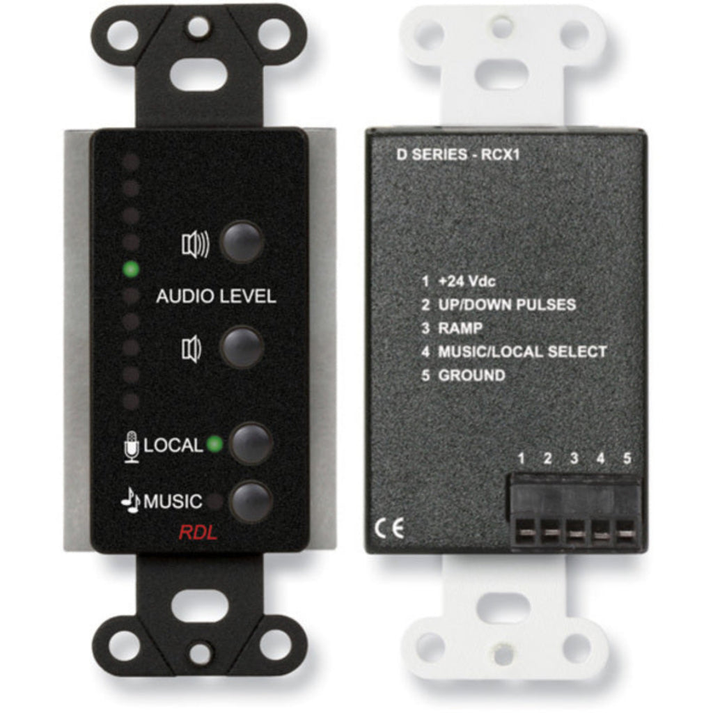 The RDL D-RCX1 Room Control features pushbutton UP/DOWN volume adjustment, and pushbutton selection between MUSIC and LOCAL (microphones and/or line level inputs). This standard RCX remote control mounts in an RDL WB-1U Wall Box.