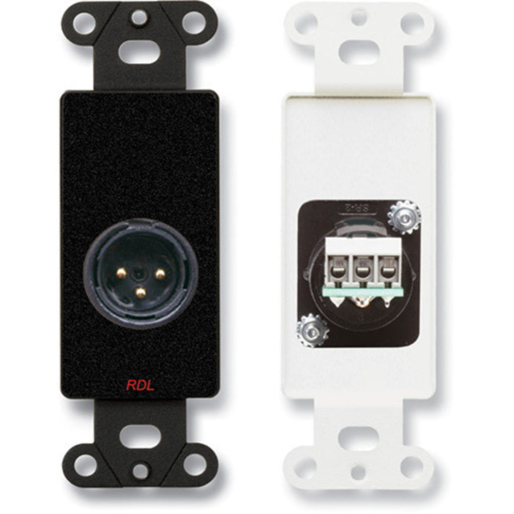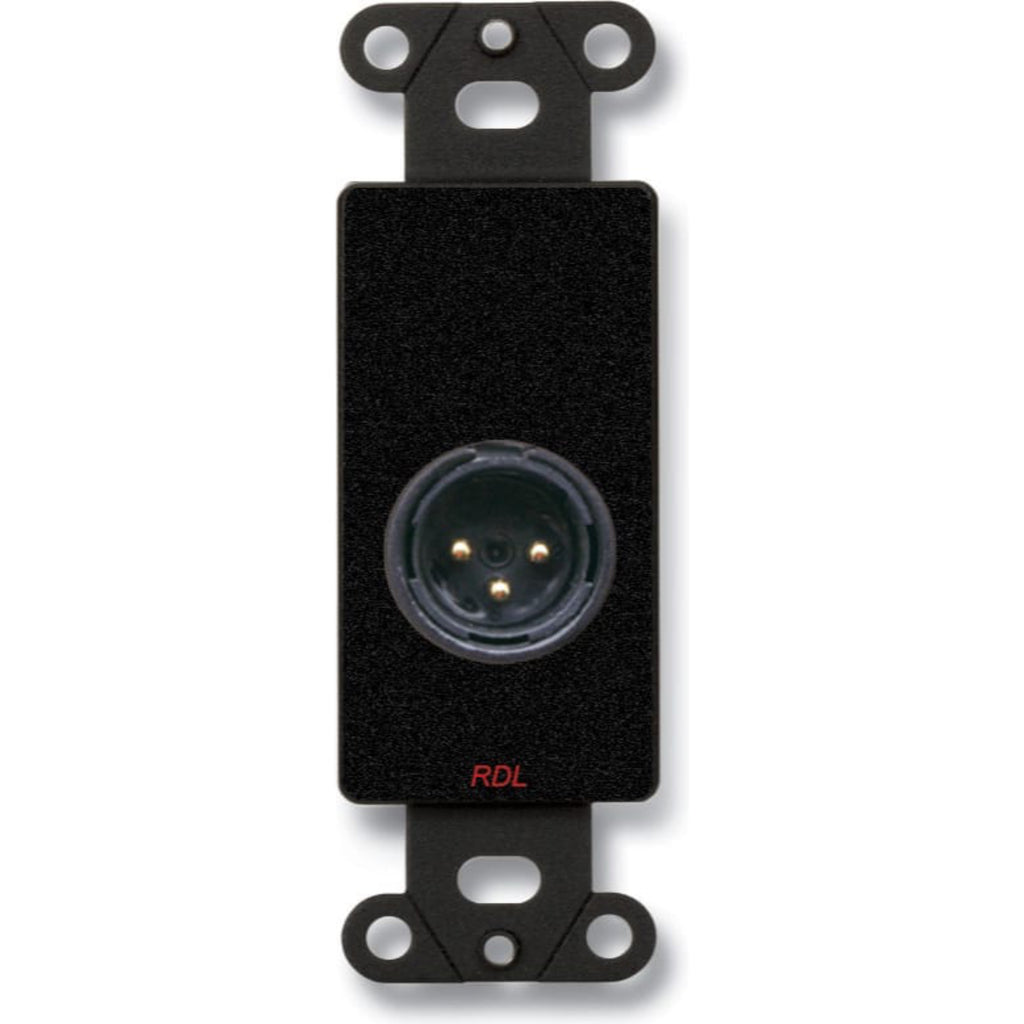 The black DB-XLR3M Decora Wall Plate from RDL features a single XLR 3-pin male connectors with rear panel connections on terminal block. This unit can be mounted in WB-1U and WB-2U Universal Wall Boxes (not included).