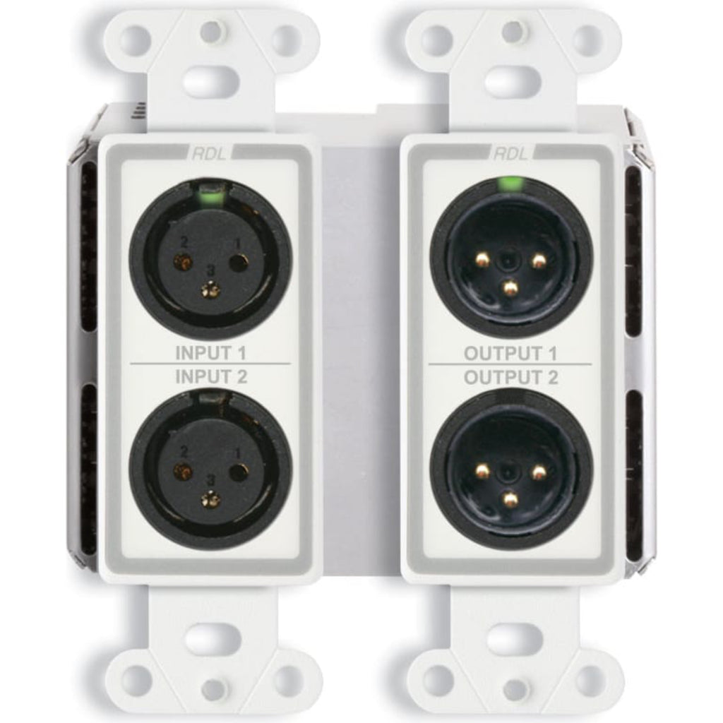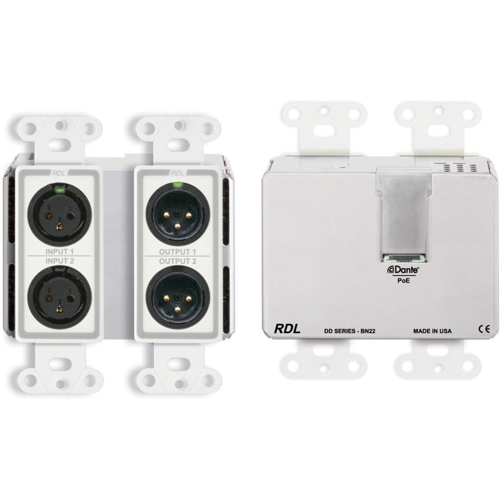 The DD-BN22 is a complete wall-mounted Dante audio network interface. It features two XLR mic or line inputs and two XLR mic or line outputs on the front panels. Special software is not required to configure the DD-BN22. Each XLR input provides three switches that may be set from the front of the unit when the cover plate is not installed. One switch enables or disables P48 phantom; the second switch selects the mic or line gain range; the third switch sets the gain. Each XLR output provides a switch to set the output to balanced professional line level or mic level. The DD-BN22 fits a standard US dual-gang electrical box or an RDL WB-2 back box for installations in thinner European or equivalent walls. The DD-BN22 is PoE powered, and is available in multiple finishes with optional customized graphics.