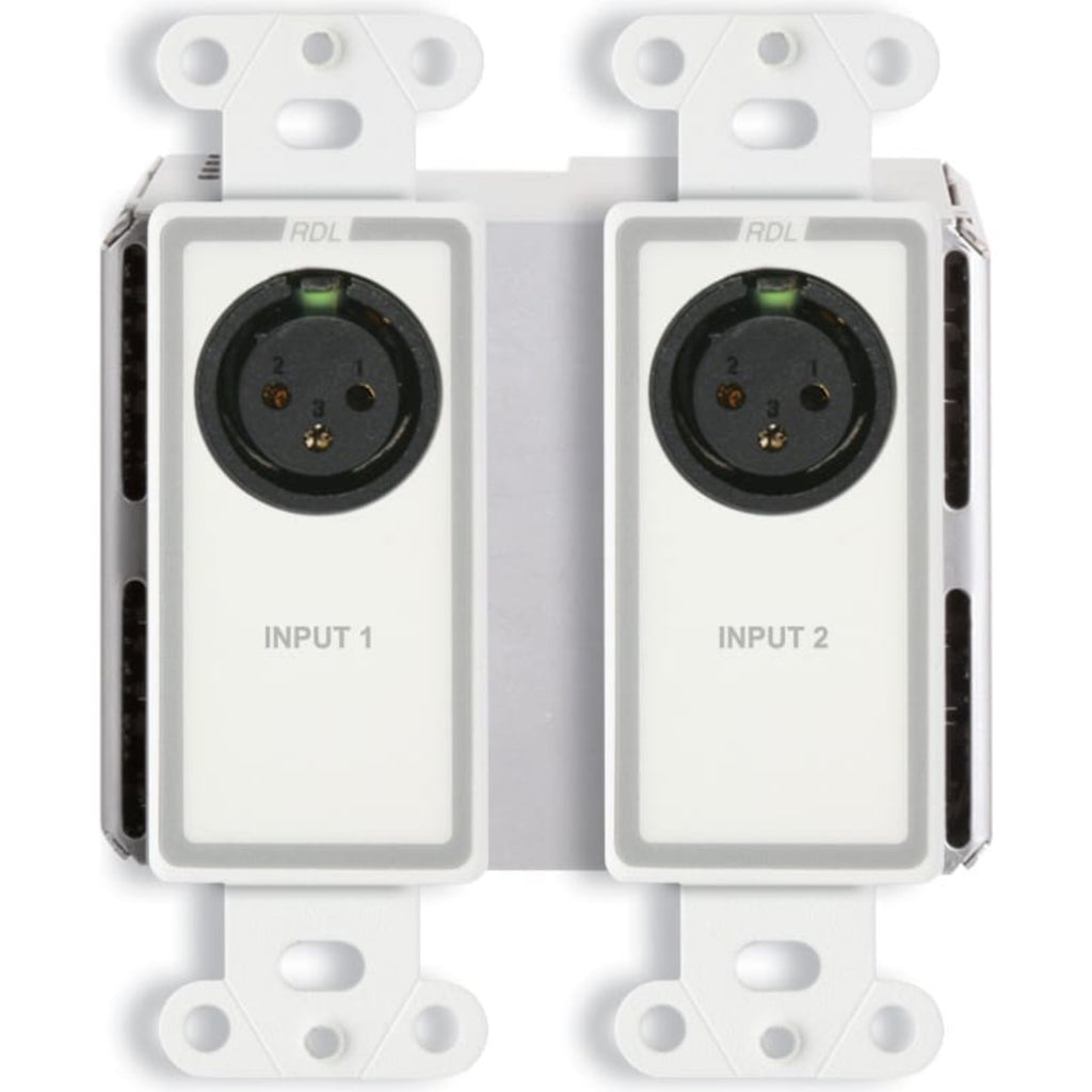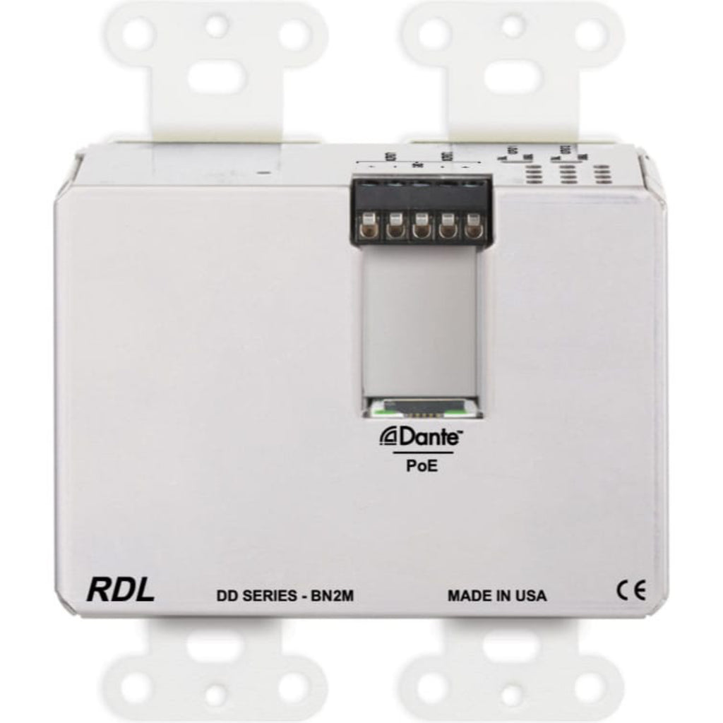 The DD-BN2M is a complete wall-mounted Dante audio network interface. It features two XLR mic or line inputs on the front panels, plus two line outputs on a rear-panel detachable terminal block. Special software is not required to configure the DD-BN2M. Each XLR input provides three switches that may be set from the front of the unit when the cover plate is not installed. One switch enables or disables P48 phantom; the second switch selects the mic or line gain range; the third switch sets the gain. Each rear-panel output provides a switch to set the output to balanced professional or unbalanced consumer level. The DD-BN2M fits a standard US dual-gang electrical box or an RDL WB-2 back box for installations in thinner European or equivalent walls. The DD-BN2M is PoE powered, and is available in multiple finishes with optional customized graphics.