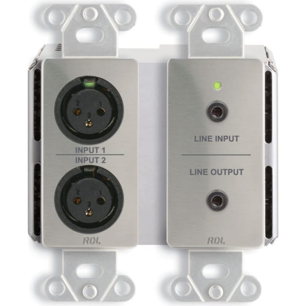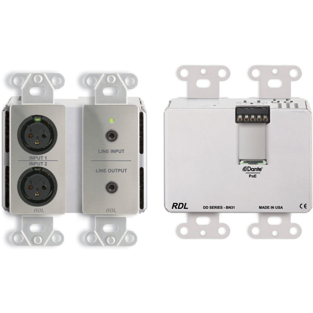 The DD-BN31 is a complete wall-mounted Dante audio network interface. It features two XLR mic or line inputs, one stereo Mini-jack line input and one stereo Mini-jack line output on the front panels, plus two line outputs on a rear-panel detachable terminal block. Special software is not required to configure the DD-BN31. Each XLR input provides three switches that may be set from the front of the unit when the cover plate is not installed. One switch enables or disables P48 phantom for that input; the second switch selects the mic or line gain range; the third switch sets the gain. The Mini-jack input provides a switch to configure the input for stereo or summed mono. The Mini-jack output provides a switch to configure the output for stereo or left-channel mono. Each rear-panel output provides a switch to set the output to balanced professional or unbalanced consumer level. The DD-BN31 fits a standard US dual-gang electrical box or an RDL WB-2 back box for installations in thinner European or equivalent walls. The DD-BN31 is PoE powered, and is available in multiple finishes with optional customized graphics.