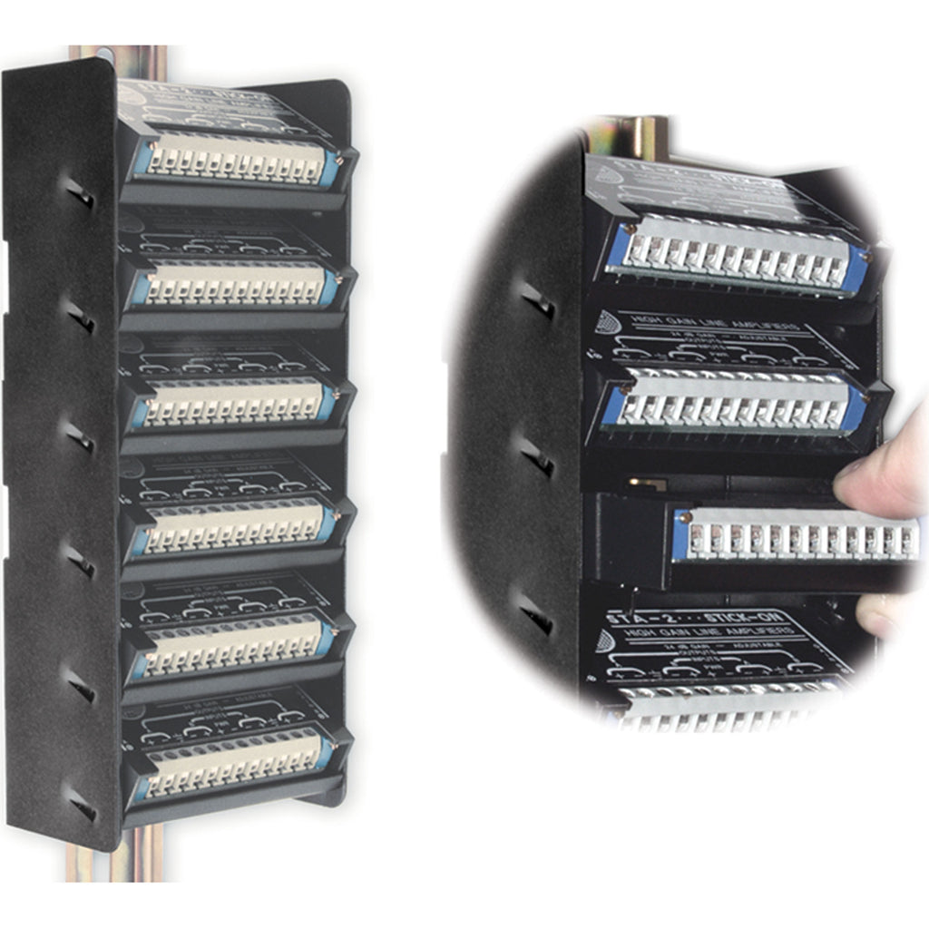The DRA-35S6 provides a convenient way to attach up to six RDL STICK-ON modules to a DIN rail. Removable shelves make installing, adjusting and removing STICK-ON modules a snap.