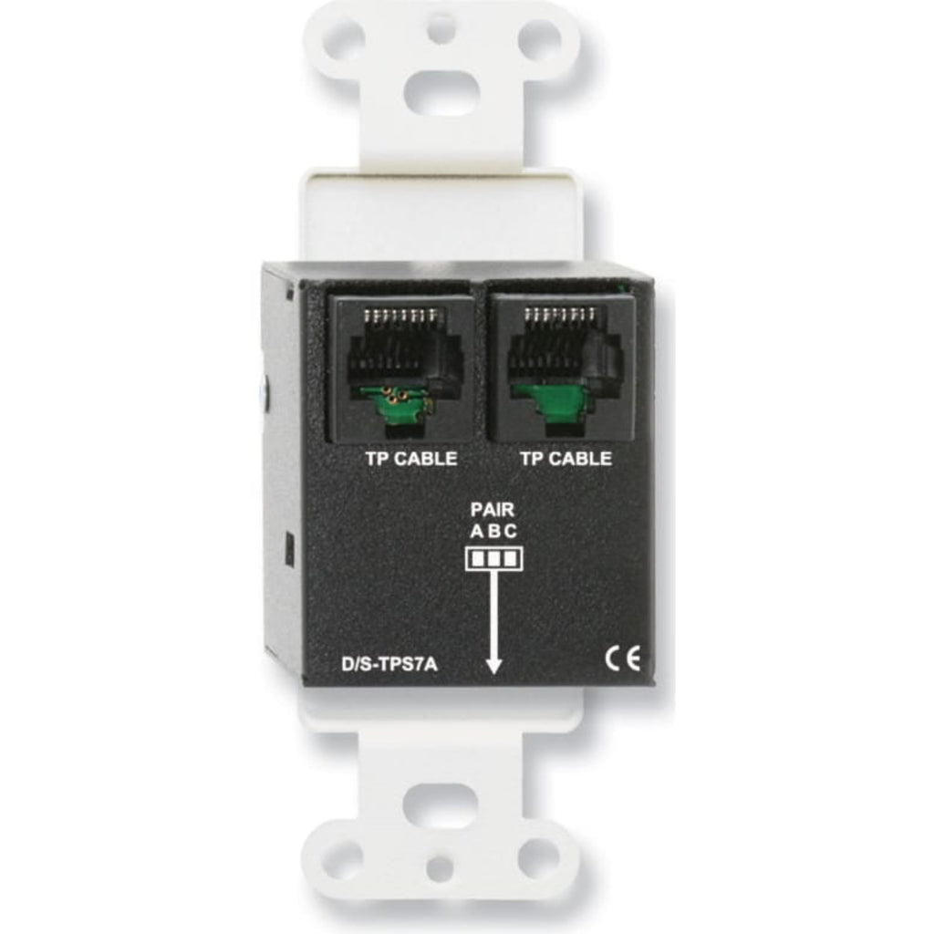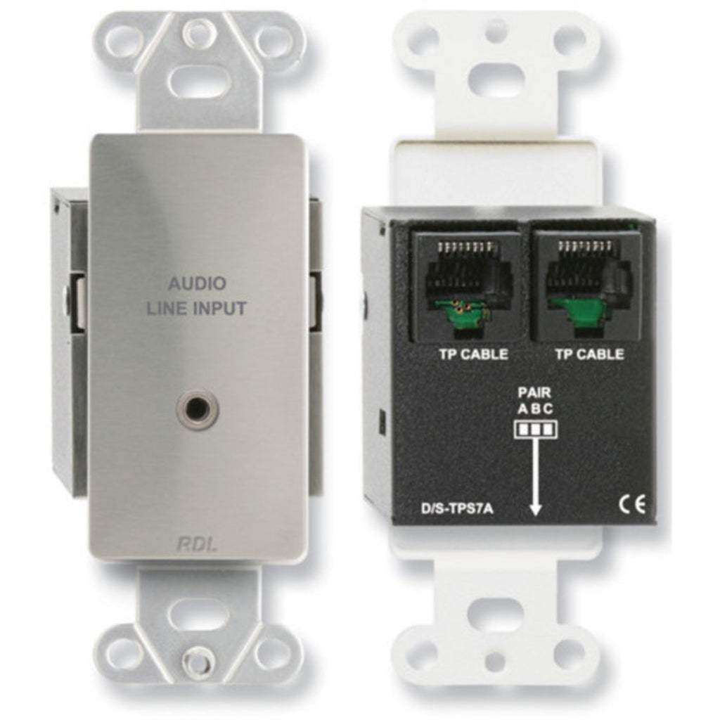 The -TPS7A is a single-pair audio sending module compatible with RDL Format-A twisted pair products. The front panel features a single stereo mini-jack intended for stereo consumer line level audio sources. A studio-quality transformer provides isolation between the audio source and the RJ45 TP CABLE.