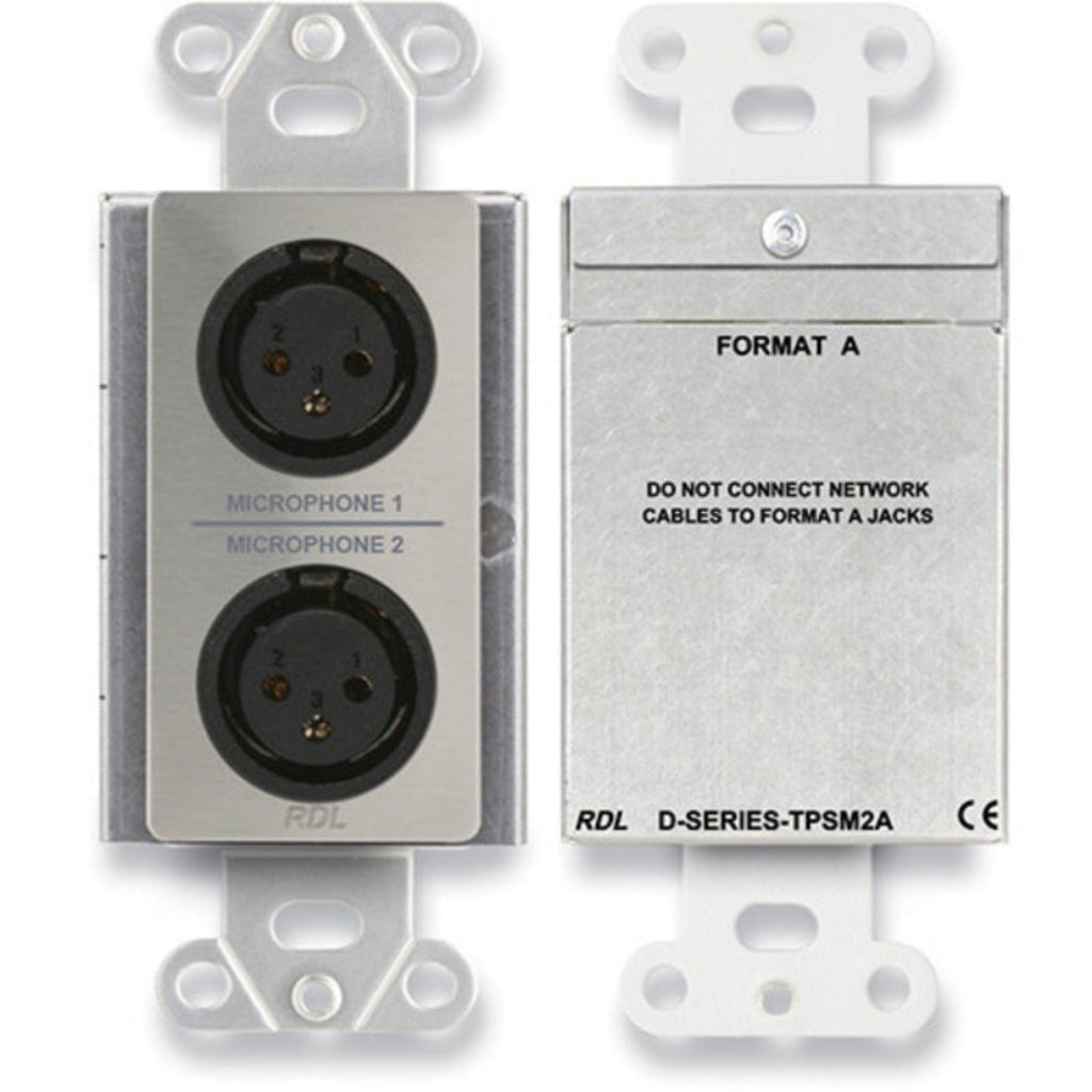 The D SERIES-TPSM2A modules are two-pair audio sending modules compatible with RDL Format-A twisted pair products. These modules are designed to be mounted in wall boxes, cabinets or other enclosures that allow users to connect audio sources. The -TPSM2A models mount in RDL WB-1U and WB-2U wall boxes, or in standard U.S. electrical boxes. The D-TPSM2A features a white front-panel laminate with gray lettering that matches RDL Decora-style remote controls. The DB-TPSM2A features a black front-panel laminate. The DS-TPSM2A is constructed of stainless steel to coordinate with RDL Decora-style stainless steel remote controls in commercial/industrial installations.