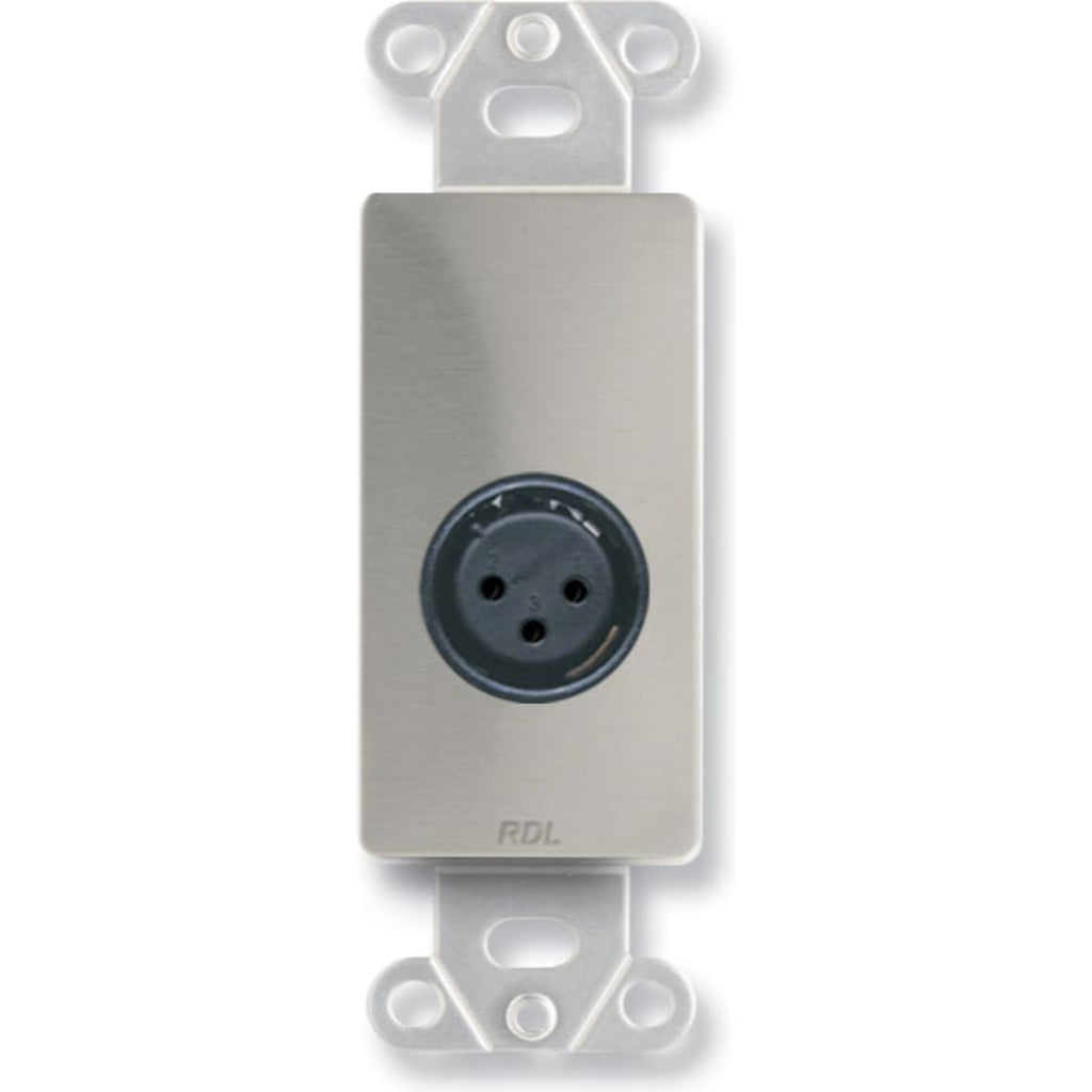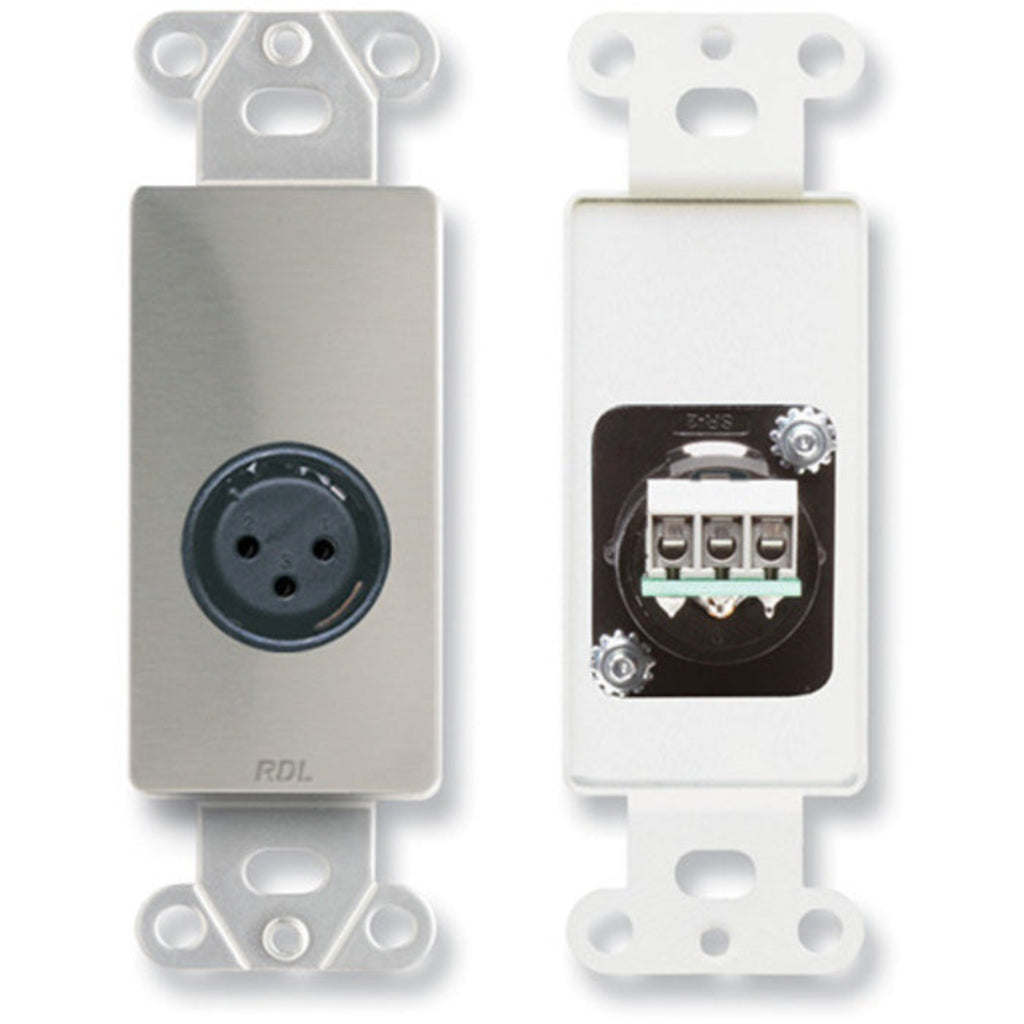 The stainless steel D-XLR3F Decora Wall Plate from RDL features a single XLR 3-pin female connectors with rear panel connections on terminal block. This unit can be mounted in WB-1U and WB-2U Universal Wall Boxes (not included).