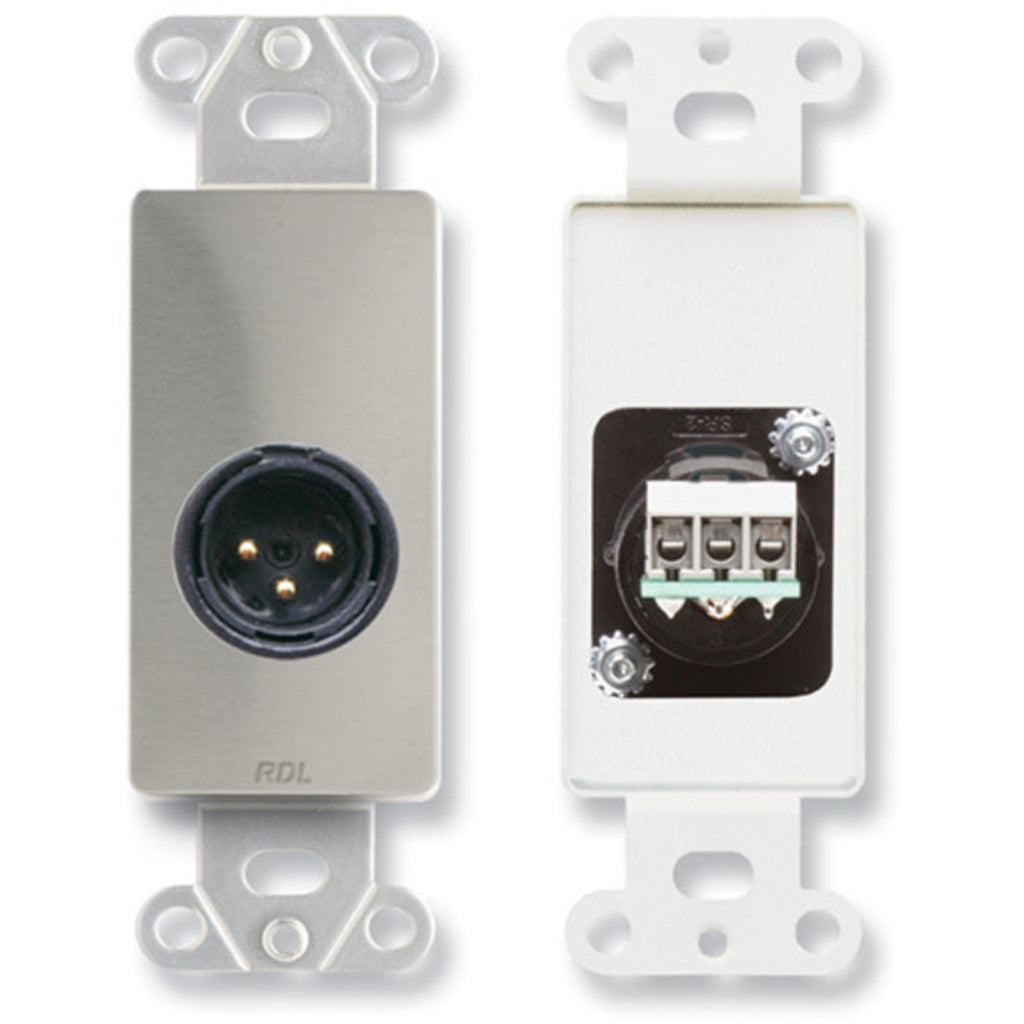 The stainless steel D-XLR3M Decora Wall Plate from RDL features a single XLR 3-pin male connectors with rear panel connections on terminal block. This unit can be mounted in WB-1U and WB-2U Universal Wall Boxes (not included).