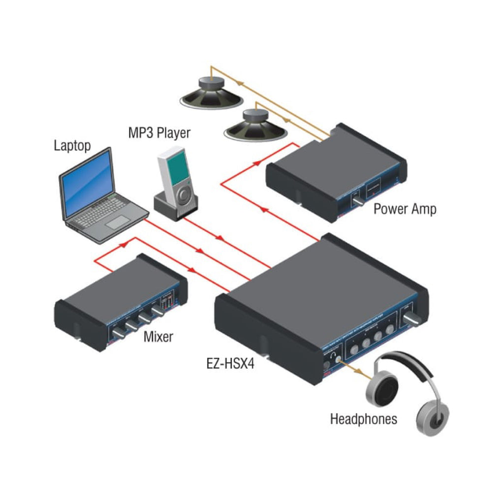 The EZ-HSX4 is a stereo audio source selector with an output volume control. Line-level and headphone outputs are provided. This unit is ideal as a four input headphone amplifier and as a source selector feeding an associated audio amplifier. The EZ-HSX4 is used in stores, houses of worship, studios, sound booths, home component systems and commercial sound systems.