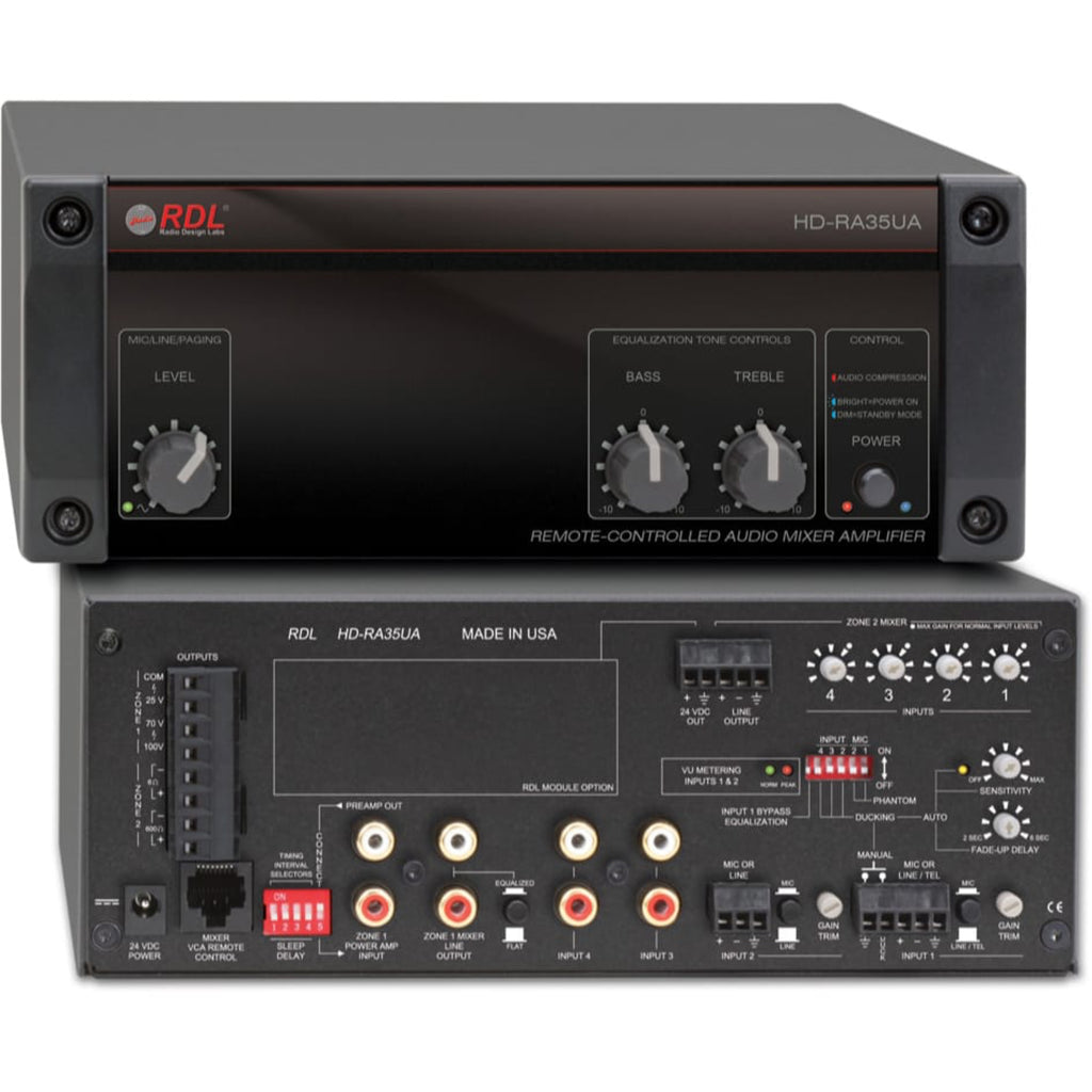 The HD-RA35UA is a four input audio mixer amplifier for systems demanding the broadest range of features and the highest energy efficiency. Two output power amplifier zones, 35 watts (Zone 1) and 4 watts (Zone 2), are driven from high-efficiency Class D amplifier stages. The mixer and amplifier sections all normally shut down (standby "sleep" mode) when audio is absent and automatically turn on when needed. A paging source is normally connected to Input 1. The Zone 1 amplifier output level for inputs 2, 3 and 4 is VCA controlled using various optional RDL remote controls. This allows the user controls to be conveniently wall mounted without running audio to and from the remote control location. The Zone 1 output provides a constant voltage output (25 V, 70 V or 100 V). The Zone 2 amplifier output drives an 8 ohm speaker and/or 600 ohm telephone equipment.