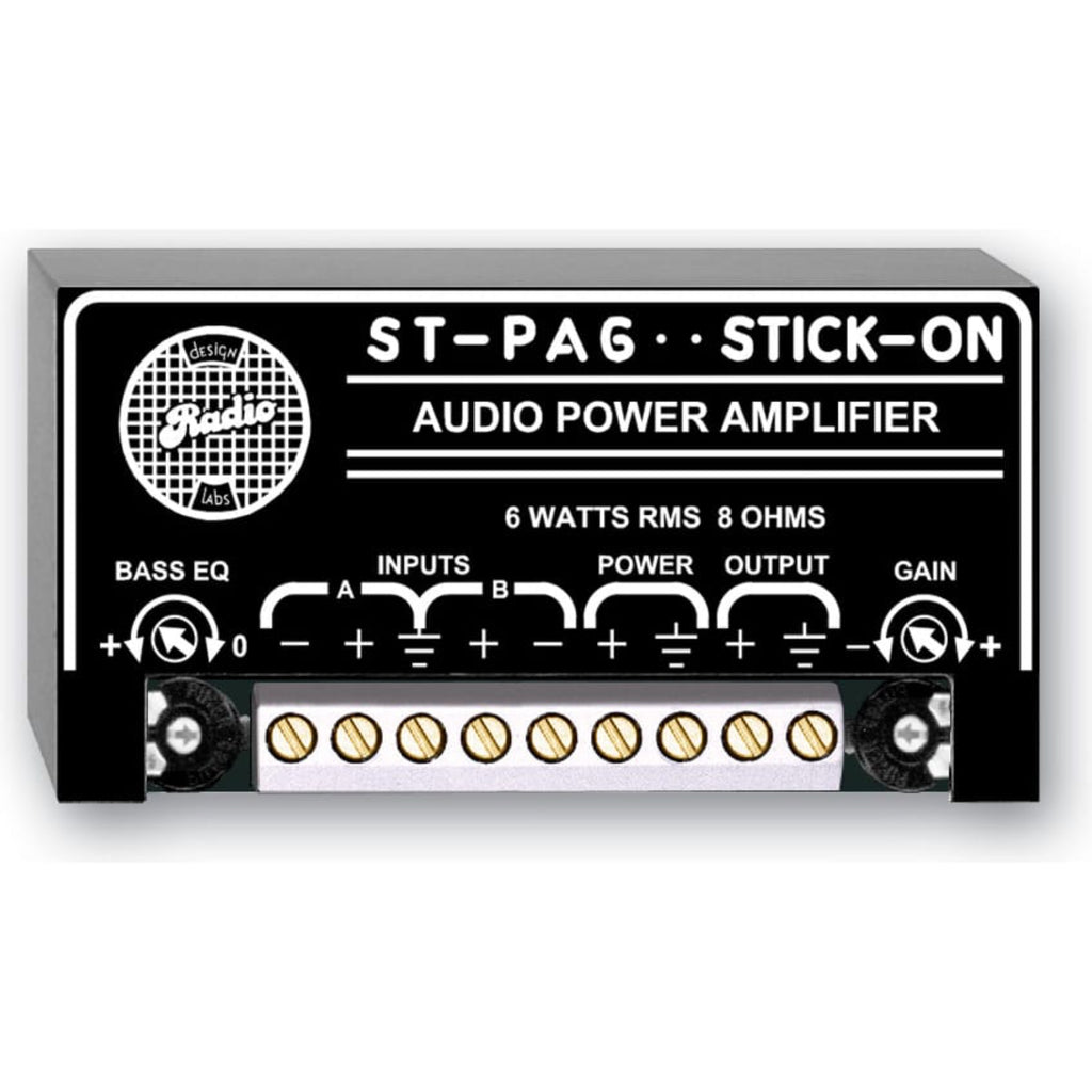 The ST-PA6 features two balanced audio inputs, a gain control, equalization control and an 8 Ω output. The output is designed to deliver a clean 6 watts RMS into an 8 Ω speaker. Each input is a balanced bridge, with the two inputs actively mixed equally. This is particularly useful for monitoring a stereo line. The output stage features protection against short-circuits and thermal overload. The output protection automatically resets once the condition is removed, making fuse protection unnecessary.