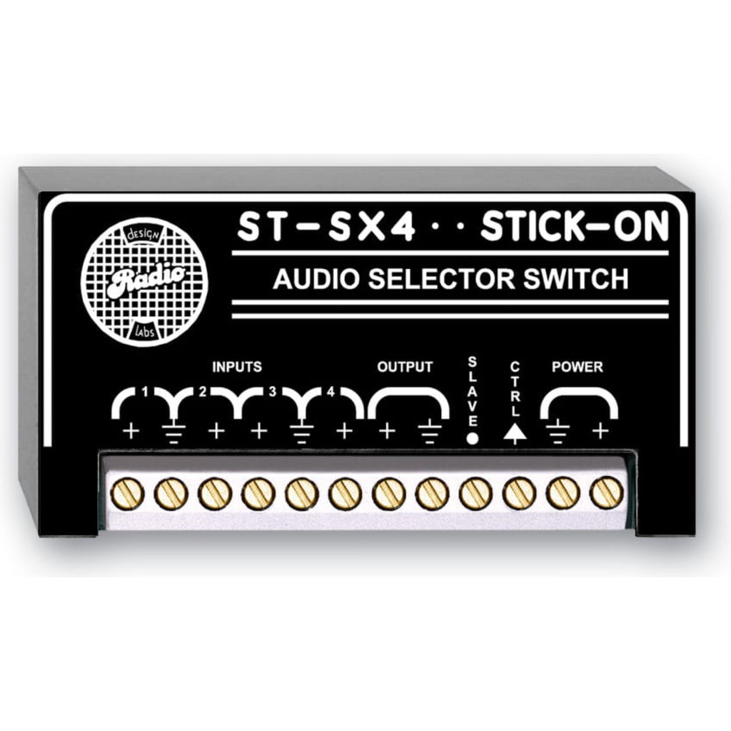 The ST-SX4 accepts up to four unbalanced audio sources. Any of these sources may be selected to feed the output, or all sources may be switched off. The output from the ST-SX4 is unbalanced. Control of the module is accomplished through a single input terminal. Connection of a specified resistance between the CTRL input and ground causes the desired input to be switched on. The necessary external resistors are supplied with the ST-SX4. The ST-SX4 may be remote controlled using the RC4-ST remote control.
