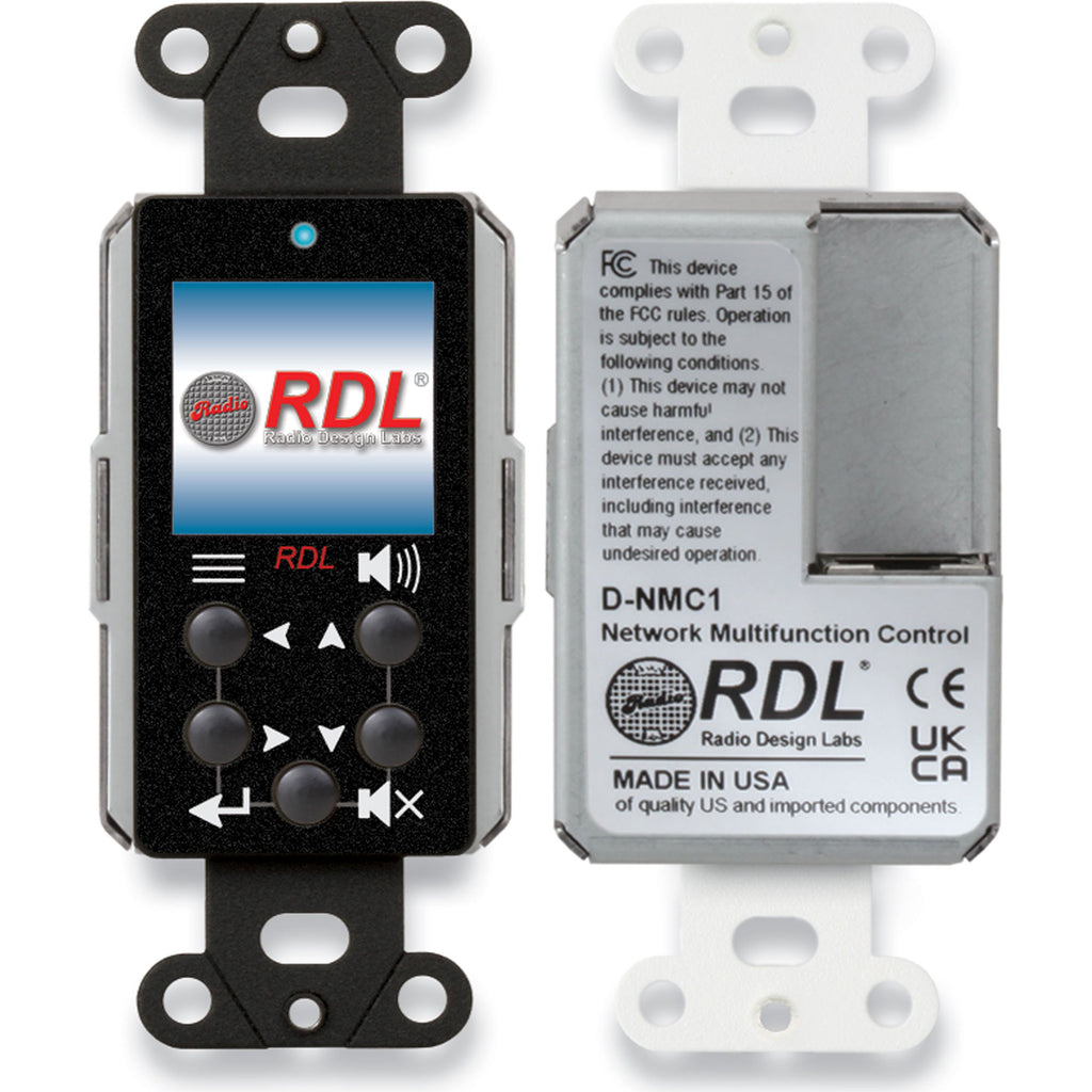 The D SERIES-NMC1 is a remote control that provides source selection and volume control at single or multiple locations. The -NMC1 connects to a digital network that may include compatible RDL audio and control modules as well as Dante devices from RDL and other manufacturers. The unit is menu-driven using a full-color LCD display. Each -NMC1 operates as a Controller or Satellite control permitting up to eight remote controls to work together to select sources, set Dante routing and adjust levels. Setup is accomplished in a web-browser session hosted by the -NMC1. The installer enables menus and submenus required to provide the desired end user control, with the option of customizing the screen menu and function names.