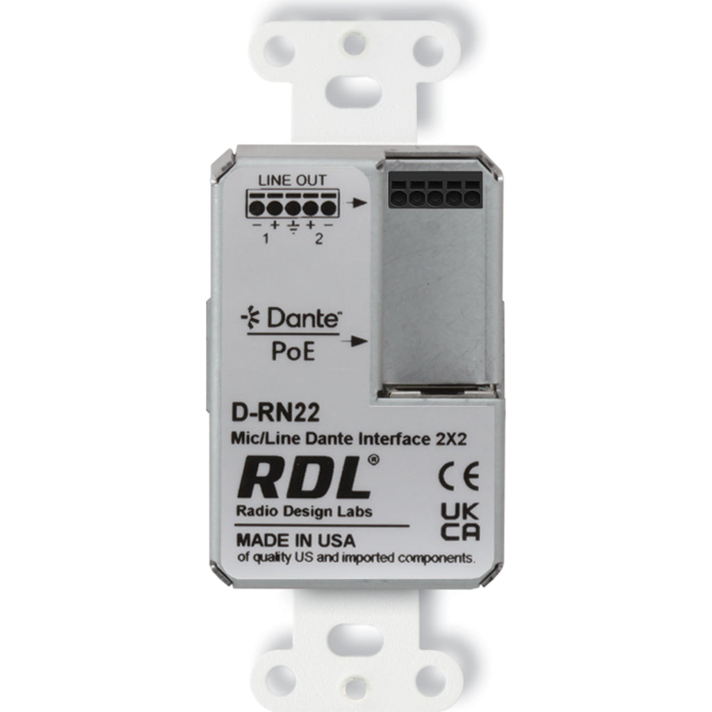 Two Dante audio channels are converted to balanced line level feeding a rear-panel detachable wiring block. Each output provides +4 dBu balanced for a network digital audio level of -18 dBFS. Each output is equipped with a software-controlled attenuator adjustable in 1 dB steps to a maximum attenuation of 63 dB then OFF. The outputs may drive local power amplifiers or may feed additional XLR jacks mounted adjacent to the DB-RN22 in a dual-gang box. Two XLR mic or line outputs may be provided using an RDL D-D2 equipped with two AMS-XLRMA jacks, available separately.