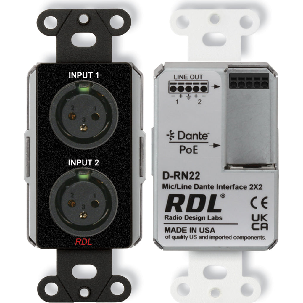 The DB-RN22 is a complete wall-mounted Dante or AES67 audio network interface. It features two XLR mic or line inputs on the front panel and two balanced line outputs on a rear-panel detachable wiring block. The module is configured and adjusted using RDL CONSOLE or other network control software. The DB-RN22 fits a standard US single-gang electrical box or can be used with the RDL EP-1 adaptor for mounting in EU/UK square back boxes with 60 mm distance screw hole mounting centers. The DB-RN22 is PoE powered and is available in multiple finishes with optional customized graphics.