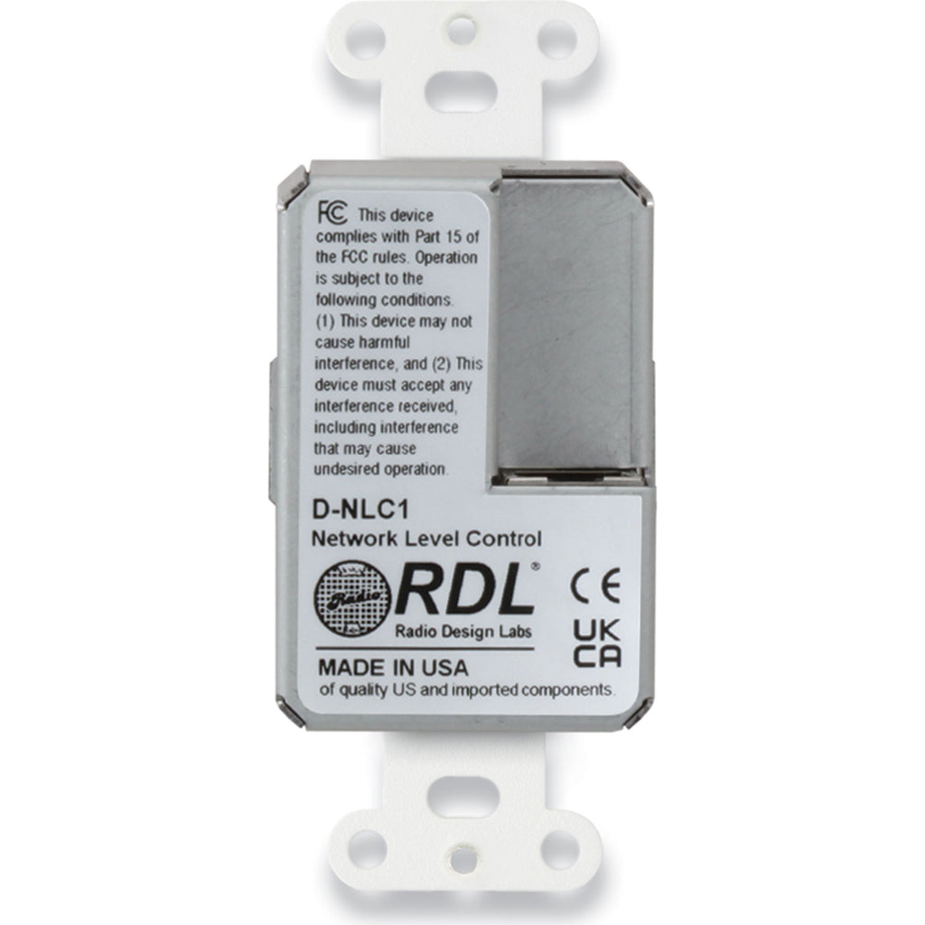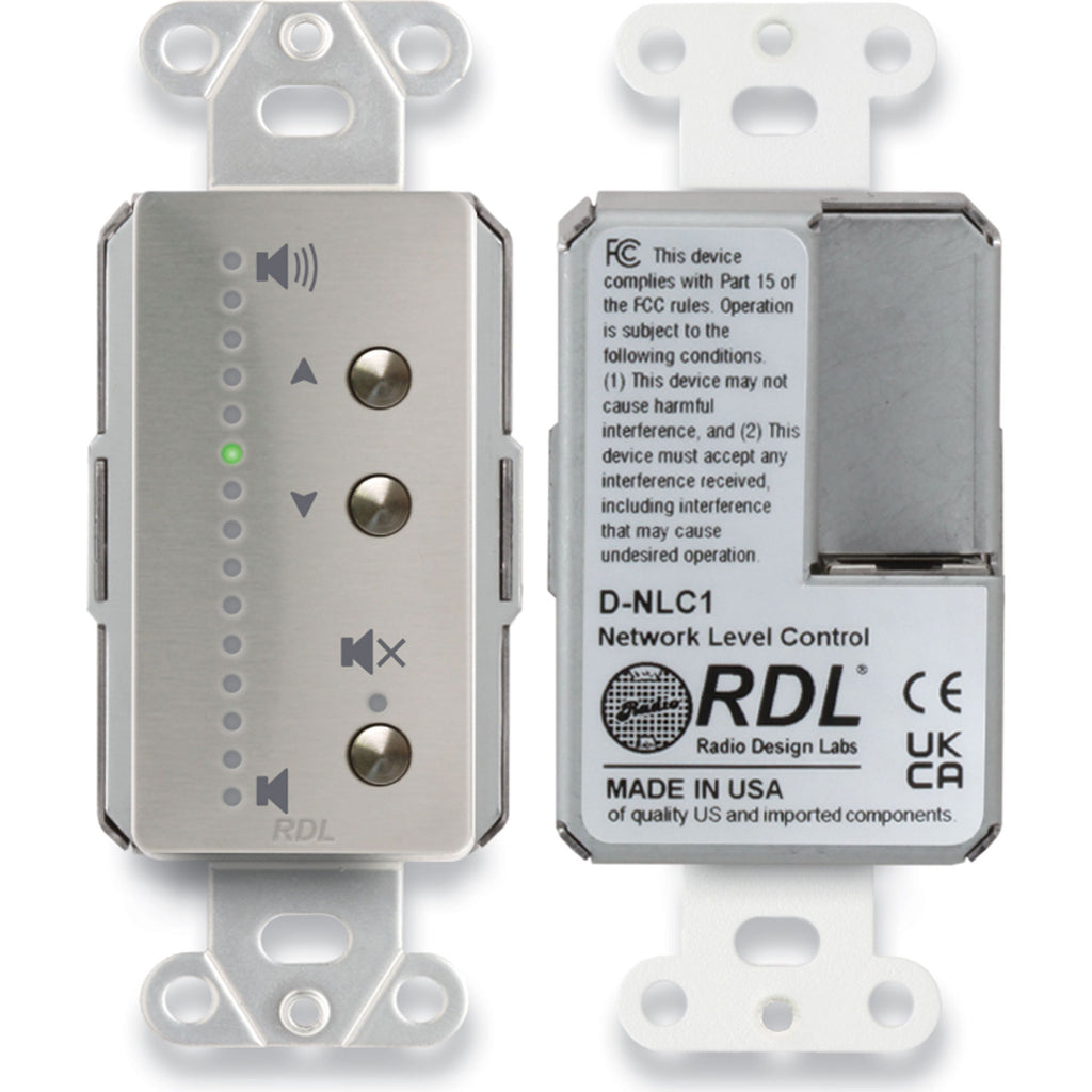 The D SERIES-NLC1 is a remote control that provides volume control at single or multiple locations. The -NLC1 connects to a digital network that may include compatible RDL audio and control modules as well as Dante devices from RDL and other manufacturers. Level is displayed on a 15 segment LED string. Each -NLC1 operates as a Controller or Satellite control permitting up to eight units to work together to adjust levels. Setup is accomplished in a web-browser session hosted by the -NLC1.