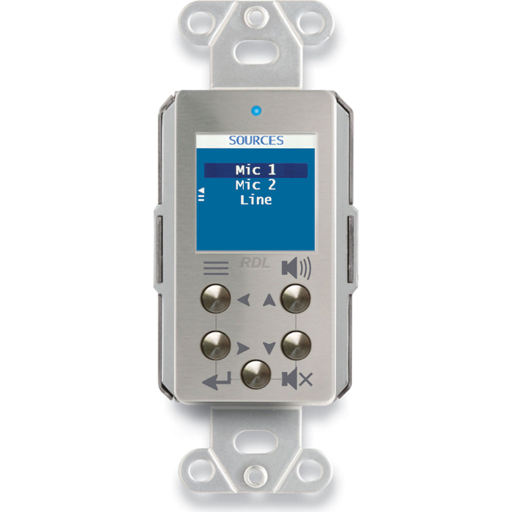 The D SERIES-NMC1 is a remote control that provides source selection and volume control at single or multiple locations. The -NMC1 connects to a digital network that may include compatible RDL audio and control modules as well as Dante devices from RDL and other manufacturers. The unit is menu-driven using a full-color LCD display. Each -NMC1 operates as a Controller or Satellite control permitting up to eight remote controls to work together to select sources, set Dante routing and adjust levels. Setup is accomplished in a web-browser session hosted by the -NMC1. The installer enables menus and submenus required to provide the desired end user control, with the option of customizing the screen menu and function names.