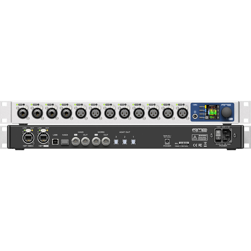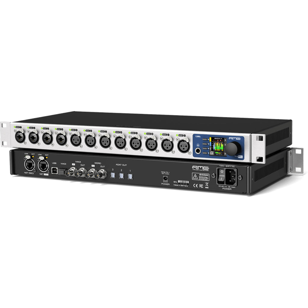 The RME 12Mic-D features twelve microphone and line level inputs with digital, no-compromise, studio-quality conversion; remote controllable gains; integrated MADI and Dante connectivity; plus a multitude of additional functionality, designed for use in high-end studio recording, live audio, and location sound and music recording.