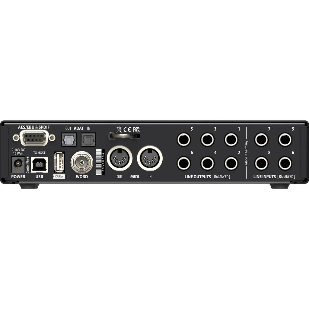 DURec is an integrated digital recorder for all inputs and outputs directly to USB memory devices via the rear USB port. It allows to record on USB thumb drives or hard drives with up to 2 TB capacity. The recording functionality is provided by the internal DSP, and is therefore independent from a connected Windows or Mac computer. This USB port can alternatively be used for direct connection of RME's optional ARC USB remote control.
