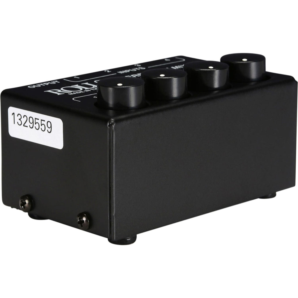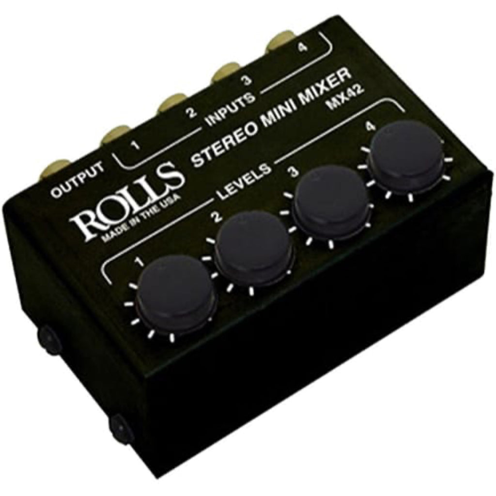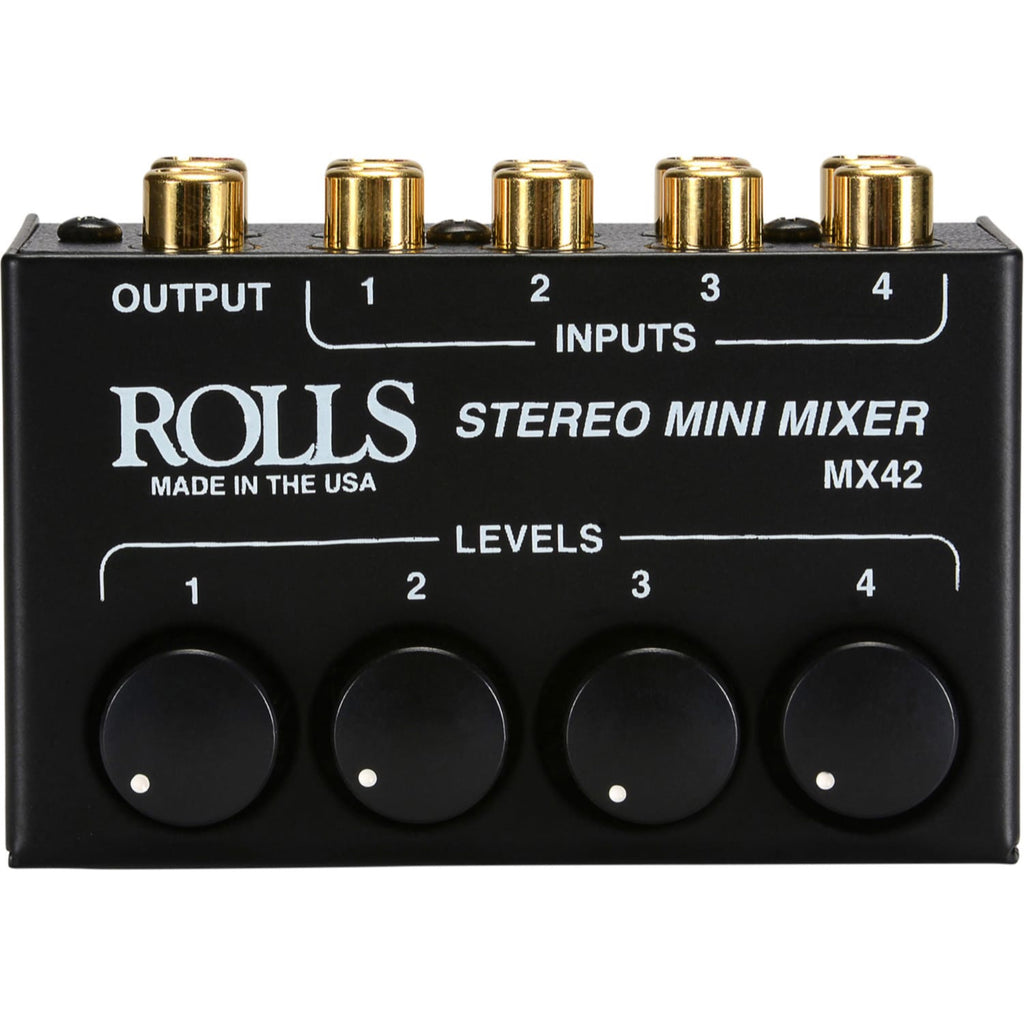 The MX42 is a four channel stereo mixer. The unit mixes up to four stereo RCA signals such as CD or cassette players with VCR units, even computer sound cards or MP3 players. All signals are mixed via stereo 100K ohm potentiometers to stereo RCA output connectors. The unit is passive, requiring no power.