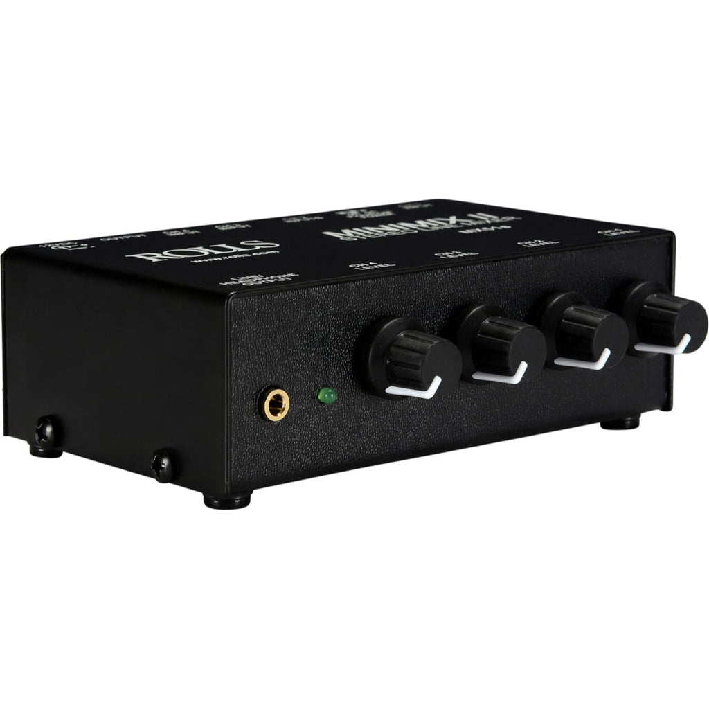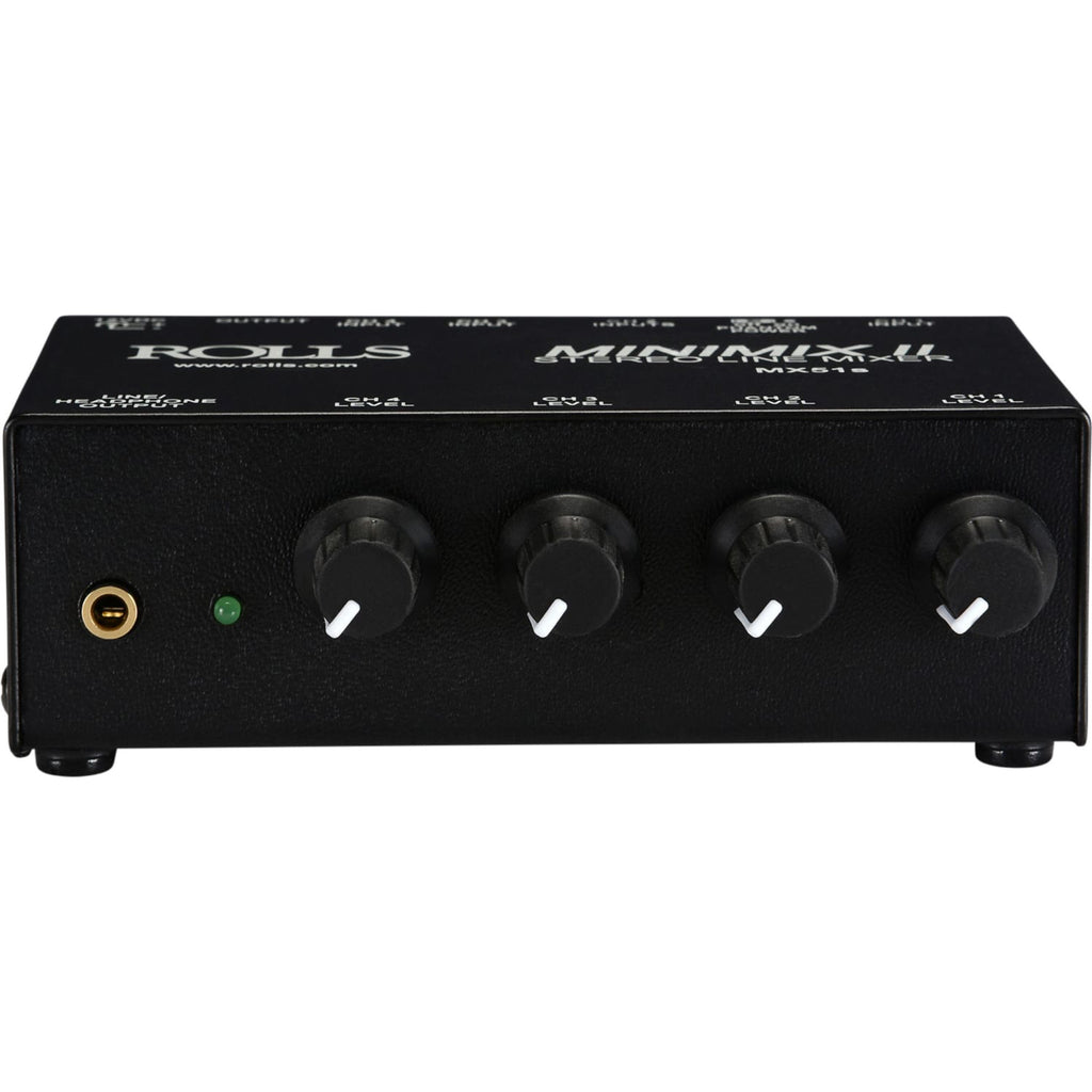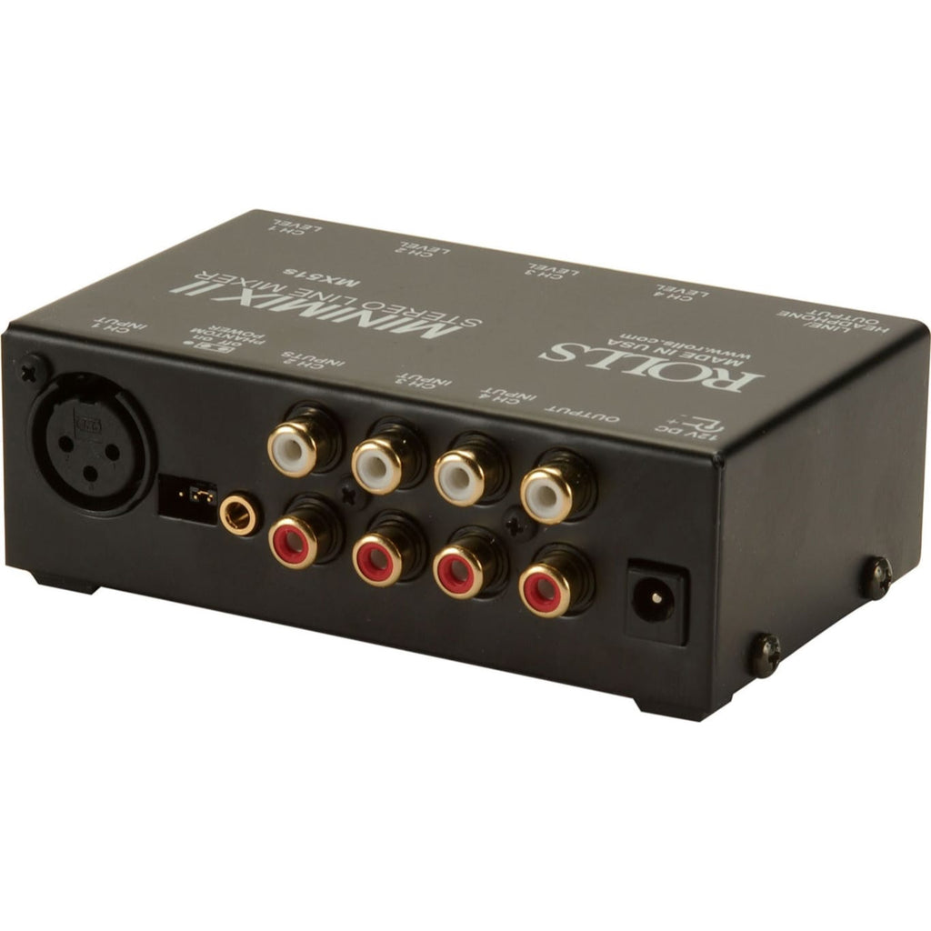 The MX51s Mini Mix 2 is small four-channel mixer with individual volume controls, and a headphone / line output. The unit has one XLR input along with an 1/8" input and 3 sets of stereo RCA inputs. It has enough gain and output level to connect to a power amplifier, with either RCA or 1/8" jacks. The MX51s is powered by an included ROLLS PS27 12 VDC adapter.